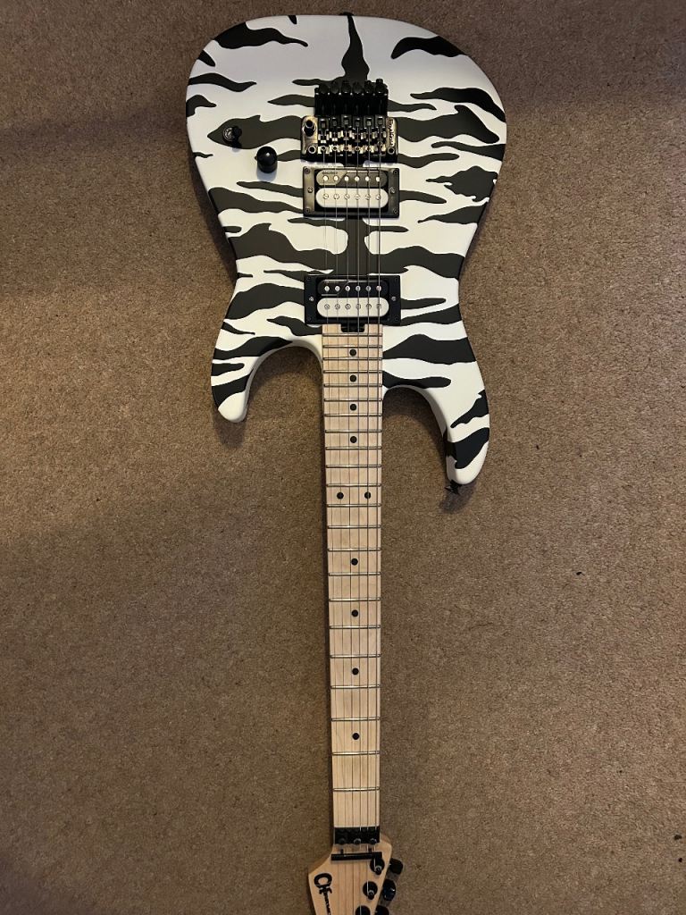 Stunning Satchel signature series Charvel Guitar Pro-Mod DK22. Finish is Satin White Bengal. The Guitar has only been played a handful of times; unfortunately it doesn't suit my playing style but I wanted to give it a go because it looks so good! You can see / hear it in action here https://youtu.be/wVG3zCtA8d8?si=zBsv15X-5skdNjQm