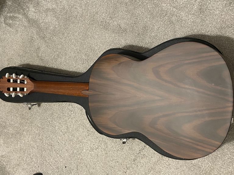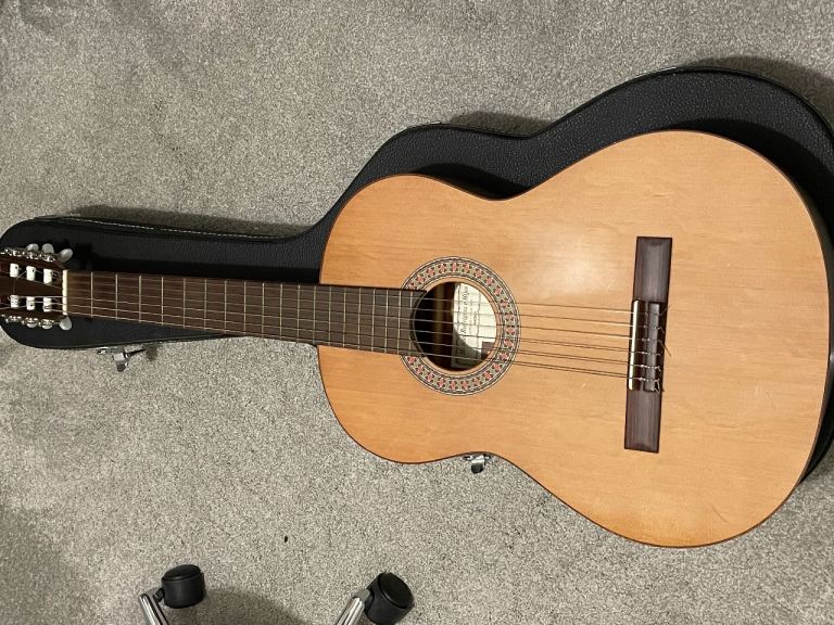 Nylon strings. Beautiful sound and in excellent condition. Also to include hard guitar carrying case also in top condition.