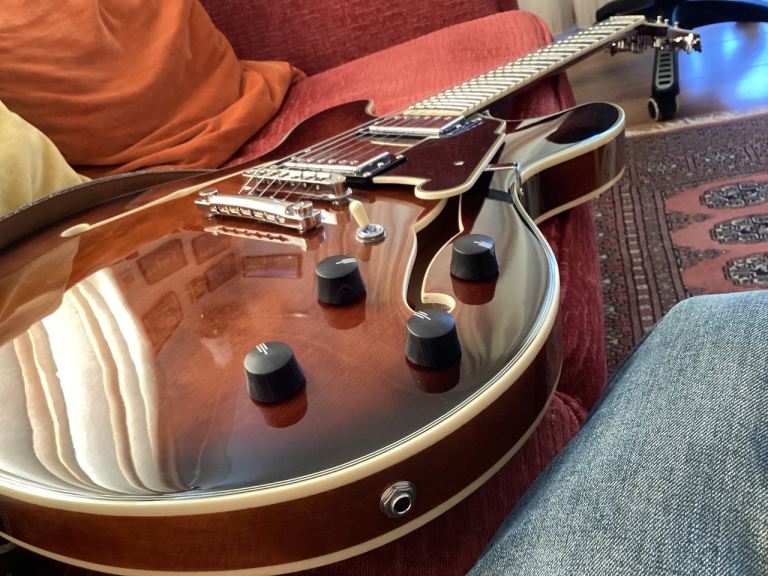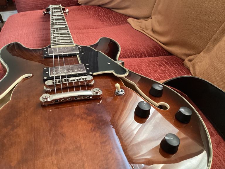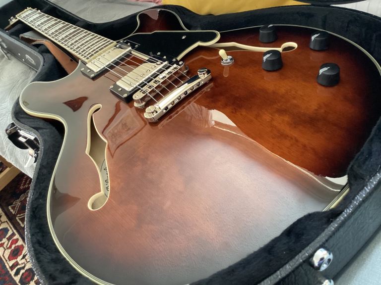 New D’Angelico Premier DC with fully registered guarantee for life, signed by the delivery distributor Center of Koln Germany, exchanged from a different previous model, the guitar as shown in the pictures it’s superbly finished and it’s perfectly set up action and intonation, medium light weight, nice semi hollow 335, perfect for Jazz /Soul/ Rock/Blues/ styles, I have set up the guitar with a comfortable low action and the tuning it’s remarkable, perfect all throughout the octave scale , it’s a pleasure to play ! There is available the original cartoon Box if needed. Selling due to retirement and health problems, so mostly of my guitar’s already sold. The retailers prices around are from £799 with D’Angelico Gig Bag, my price it’s very much low and I included a nice hard new Case that cost £95. It’s for collection in Ripley Surrey.