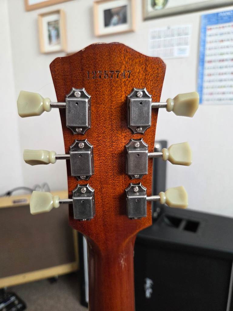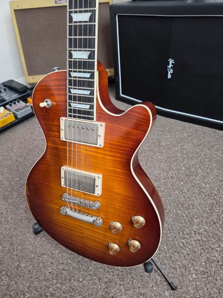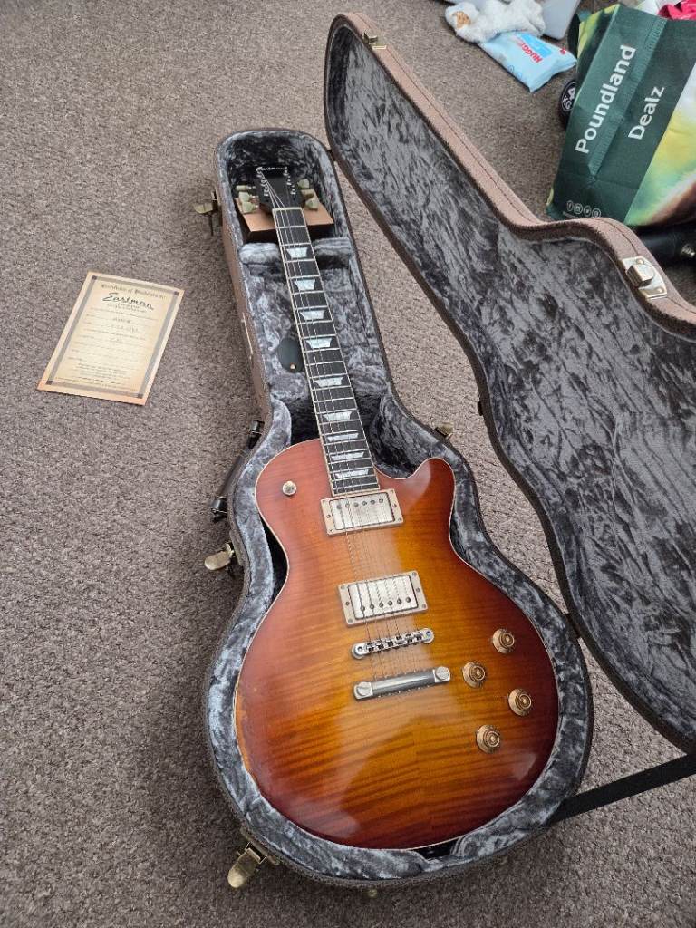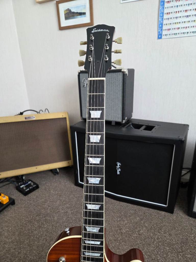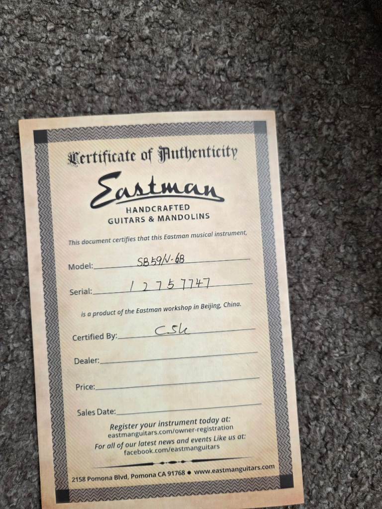 This Eastman SB59 has the "v" finish specification which essentially means it has been antiqued in Eastman's orchestral strings shop. This essentially gives it the lowest, feel and tone of a 58 year old guitar. The antique Goldburst finish features a hand carved solid flame maple top on a solid ine piece mahogany body a one piece mahogany neck, ebony fingerboard, Gotoh aged hardware and a pair of custom wound Lollar humbuckers. For some reason the binding on the guitar looks white in the pictures but it's not it's perfectly aged to compliment the guitar. Serial number is 12757747.