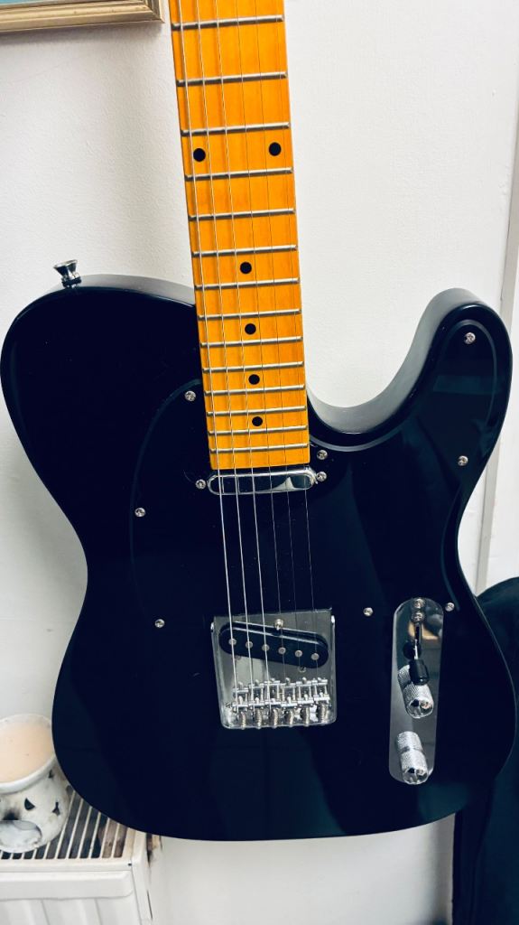 Description from Gear4music: Crafted from a smooth maple neck, rich basswood body and a maple fretboard, the black Knoxville guitar provides a player-friendly platform to begin your guitar journey. With two single-coil pickups and a three-way switch, the Knoxville guitar is incredibly versatile, allowing you to experiment with all manner of playing styles.