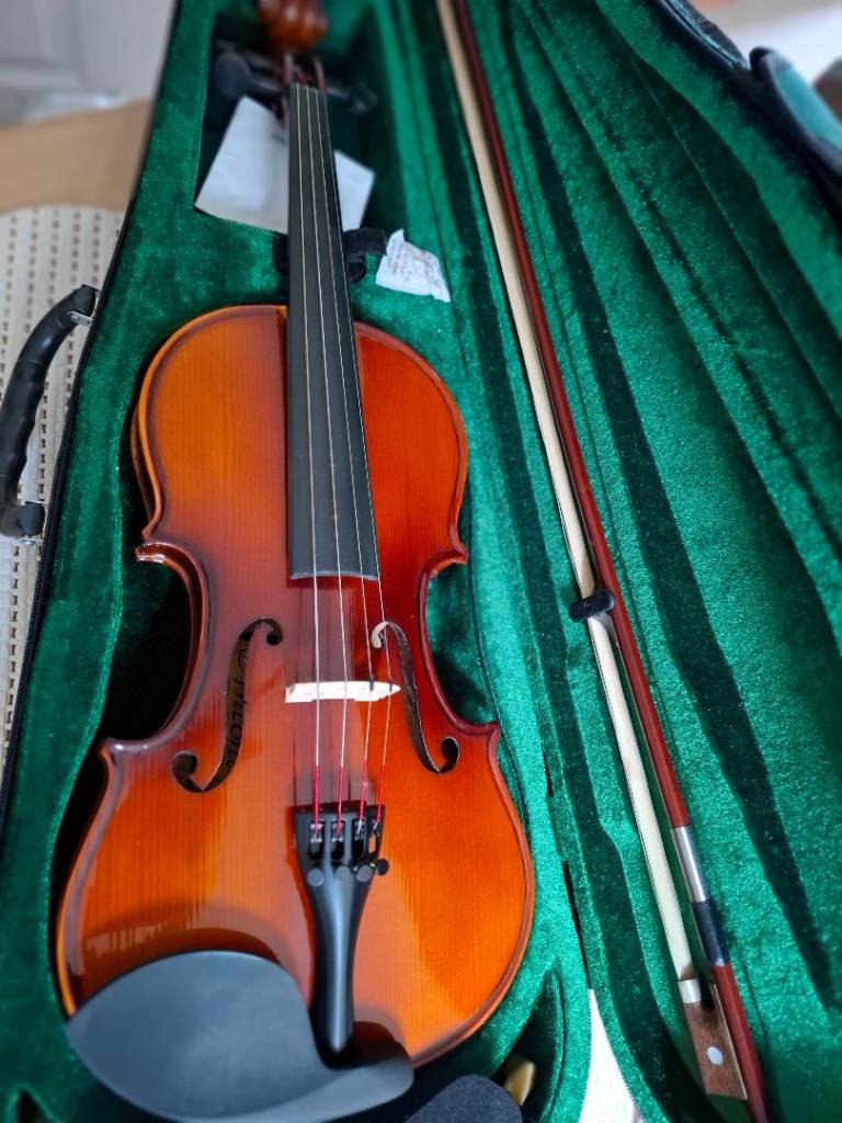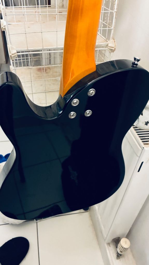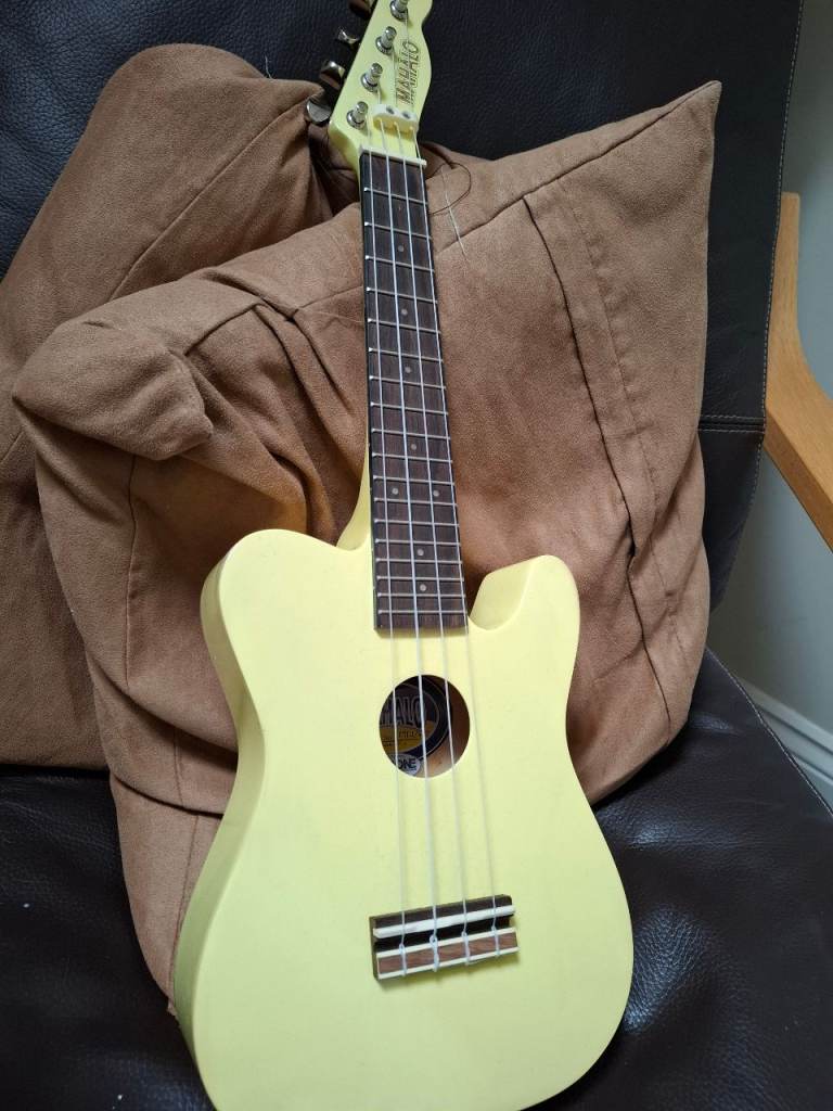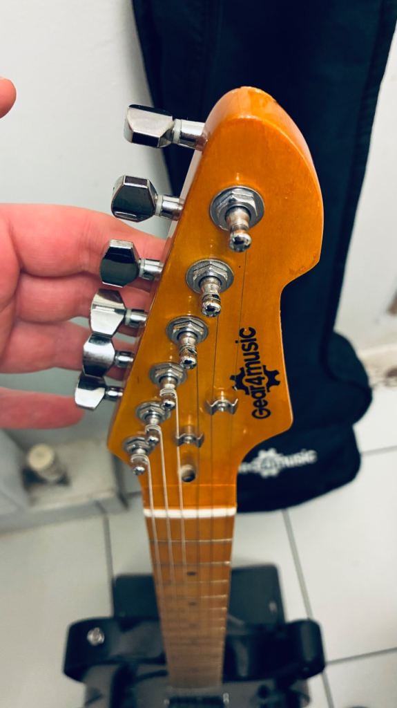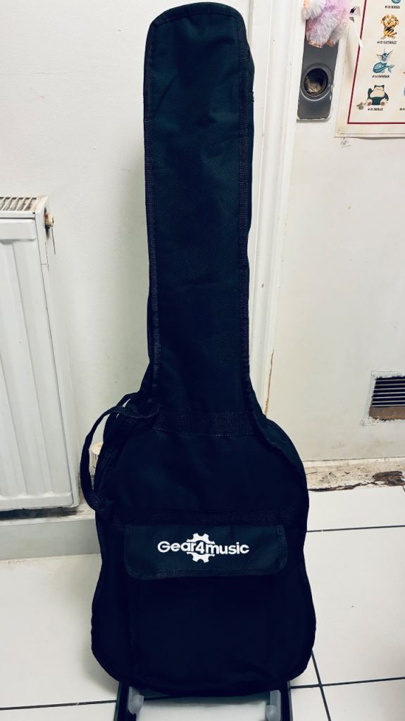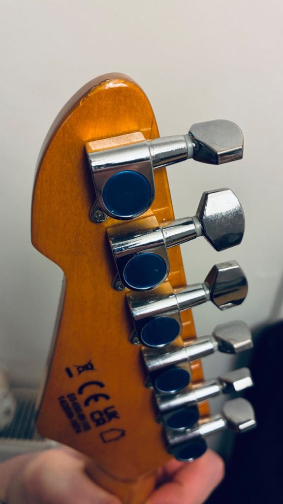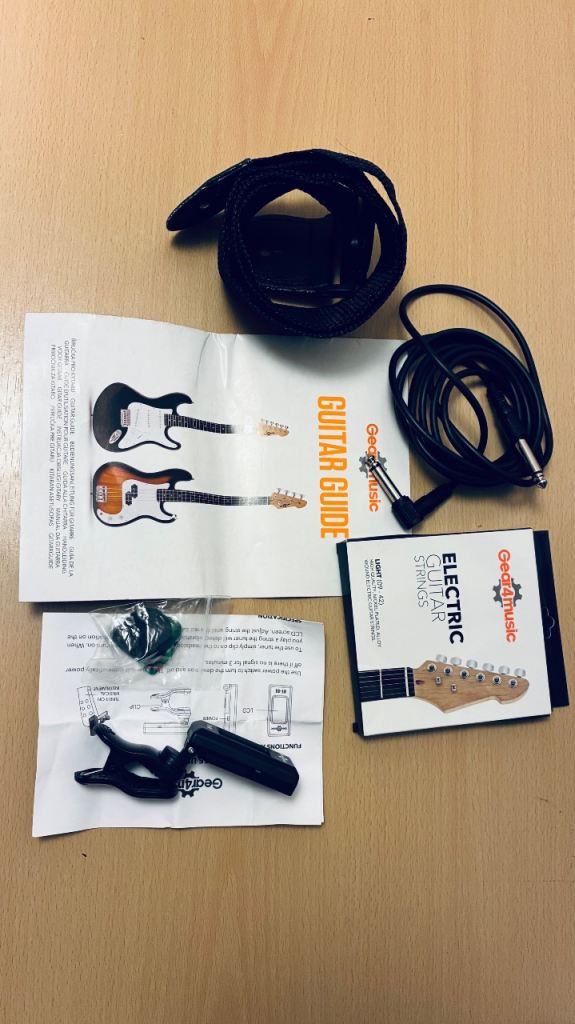 The guitar has been used a few times by beginner. Slight chip at the very top at the back as pictured, I’m guessing this is from where the guitar tuner was clipped on to. Including a bag, a strap, some washers and picks, manual, spare strings, wire for amp (no amp included) and a tuner which I think battery needs changing because the display flickers. (Guitar stand not included)