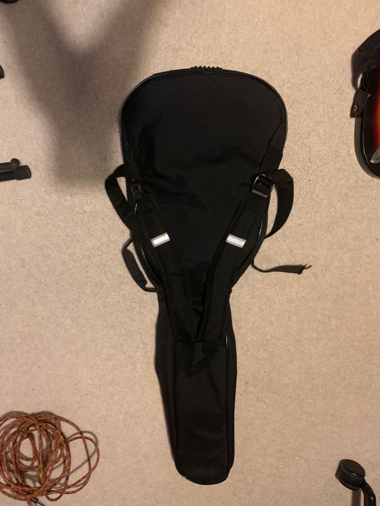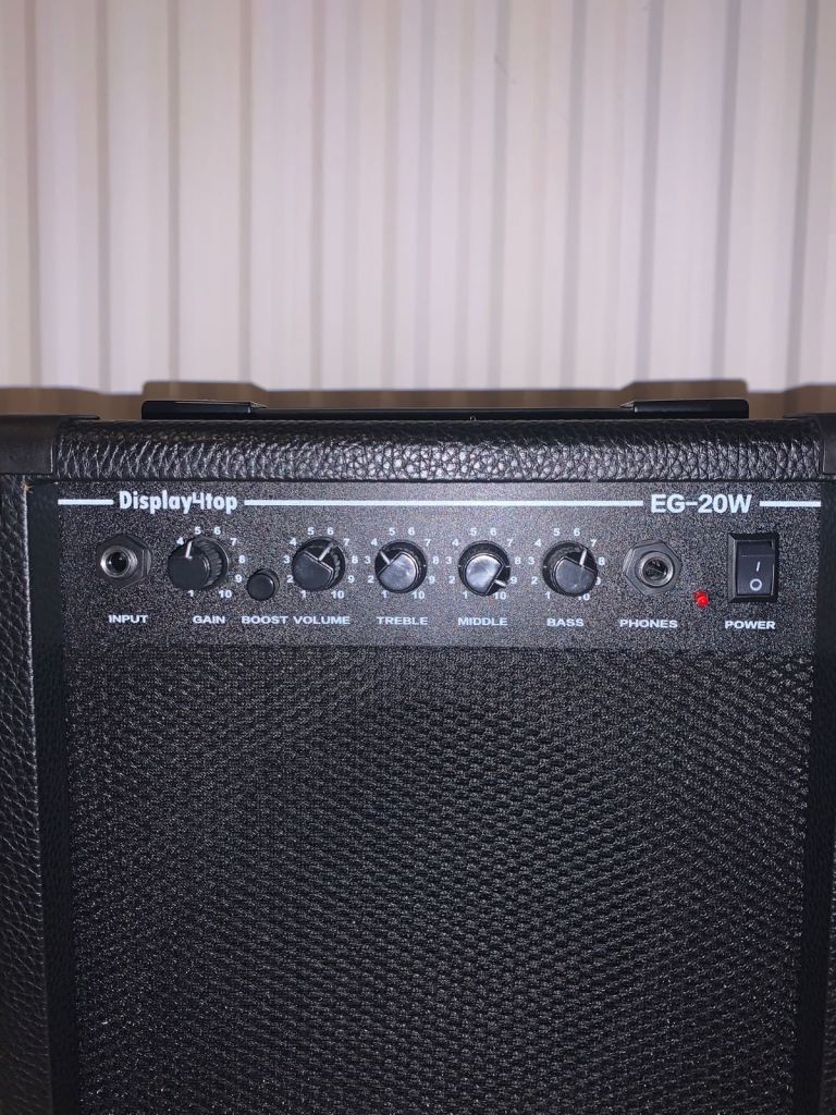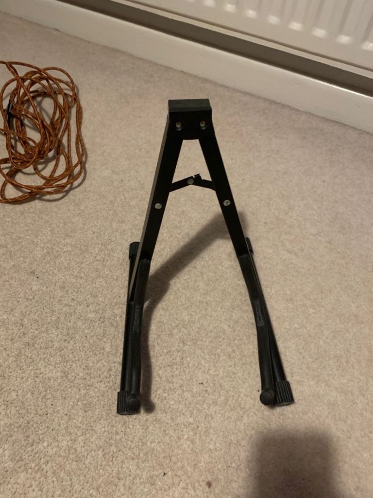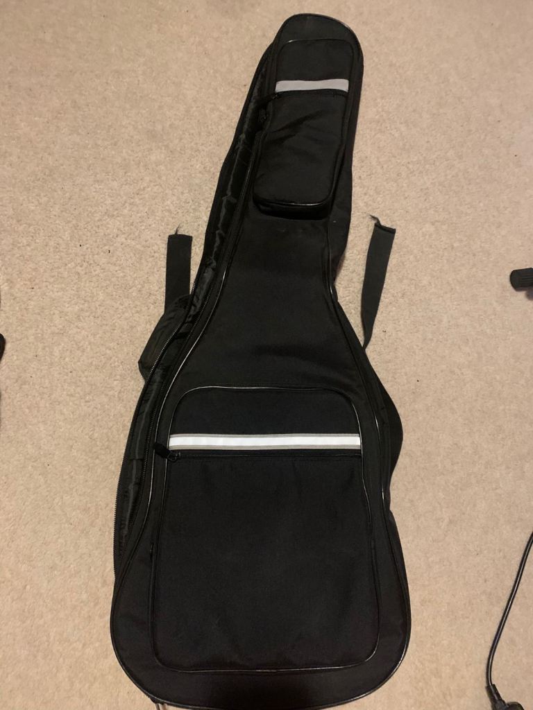 Electric guitar with amp, stand, case and 6m cable.