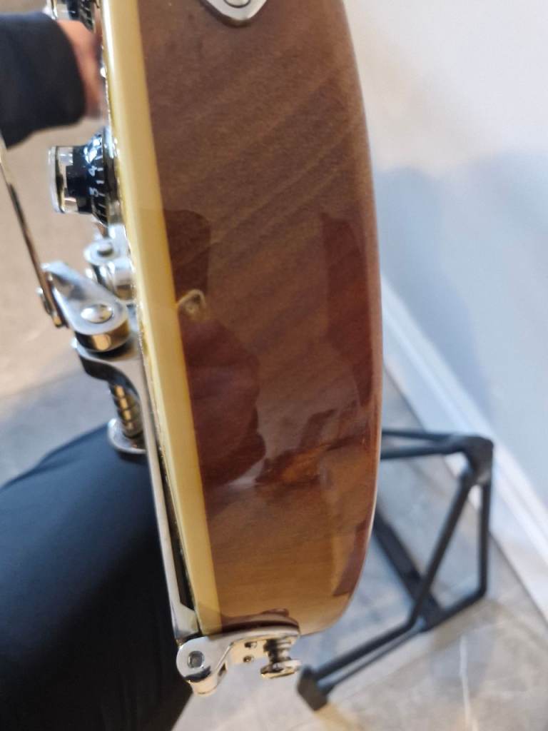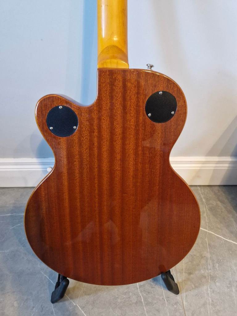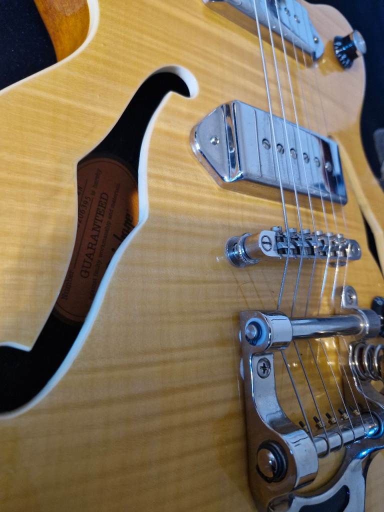 The Epiphone Wildkat is a compact, semi-hollow electric guitar with a distinctive vintage style, featuring a mahogany body, maple top, and dual Dogear P-90 pickups. Known for its versatile, "rude" rockabilly and bluesy tone, it usually includes a Bigsby B70 vibrato, making it a popular, affordable choice for players seeking unique, retro looks and comfortable playability. 2 small marks on the guitar as shown on the picture. Plays like a dream. Beautiful unique guitar, and hard to find. Only selling to fund another guitar. Sensible offers only please. Will throw in a brand new epiphone hard case for an extra £20. Guitar has never left the house.