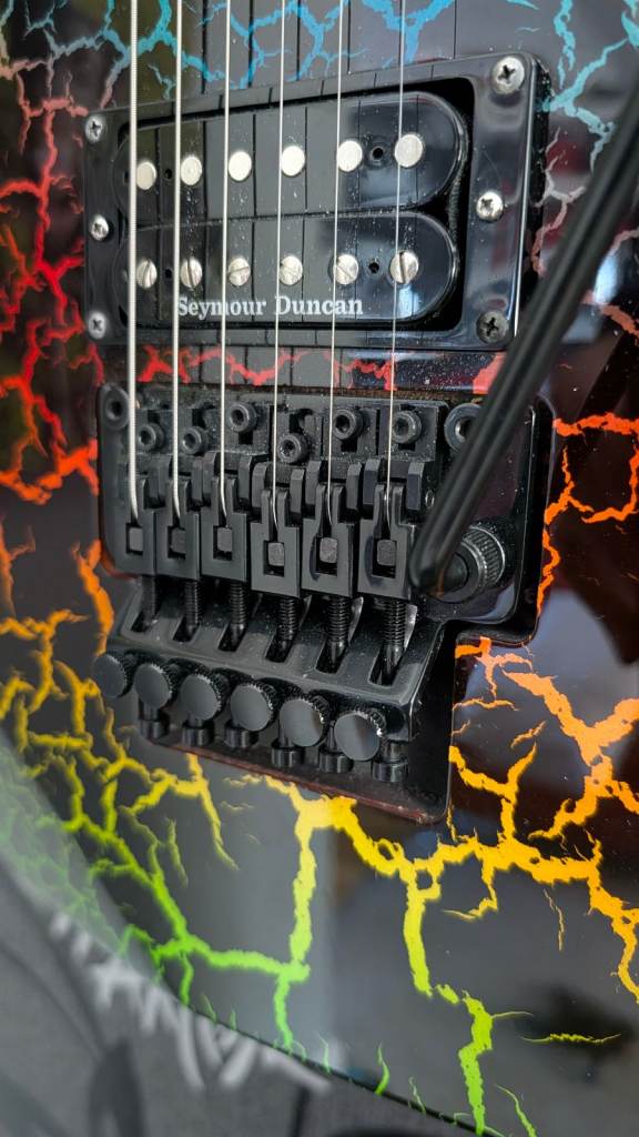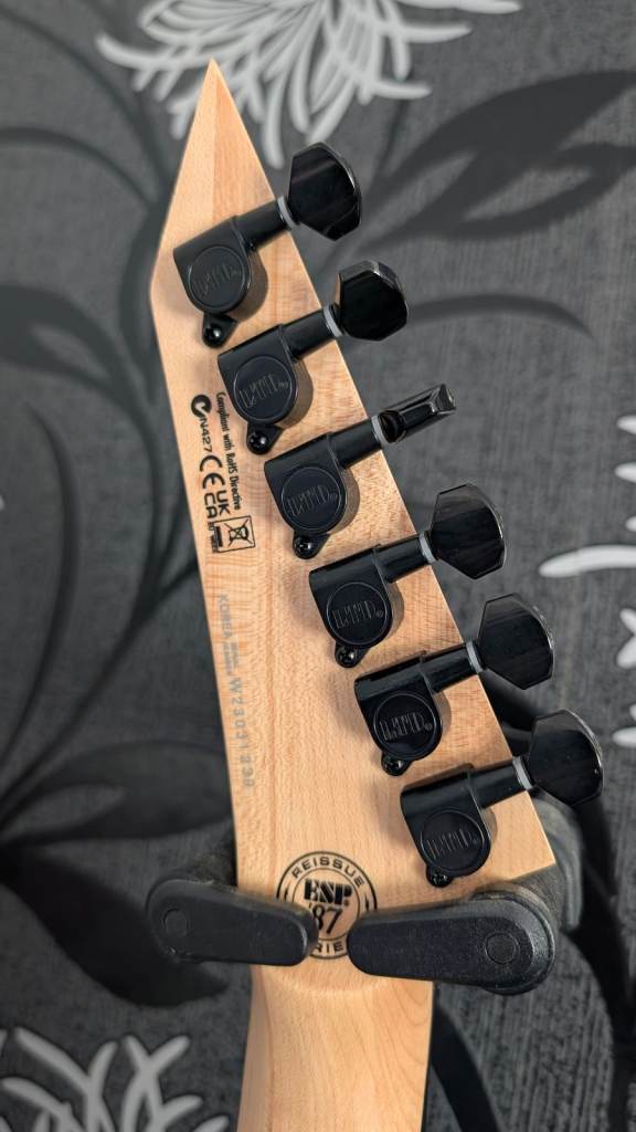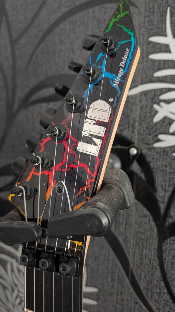 Released as part of ESP’s 1987 Series tribute collection, this model is a faithful modern recreation of the classic late‑’80s Mirage — complete with genuine Floyd Rose hardware, high‑output Seymour Duncan pickups, and that unmistakable “hair metal” era crackle finish.