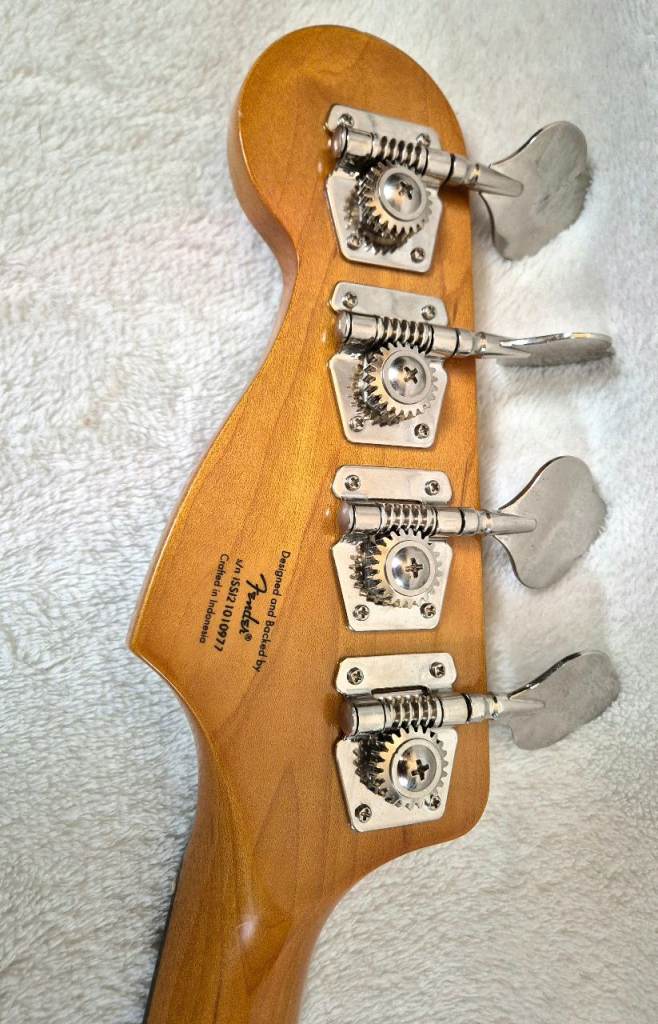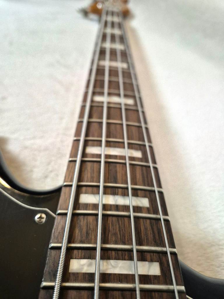 This bass is offered in fair condition. Cosmetically good, the upper portion of one of the stacked knobs is missing. The jack socket is also slightly loose, owing to the nut being cross-threaded. The electrics work and it plays and sounds great.