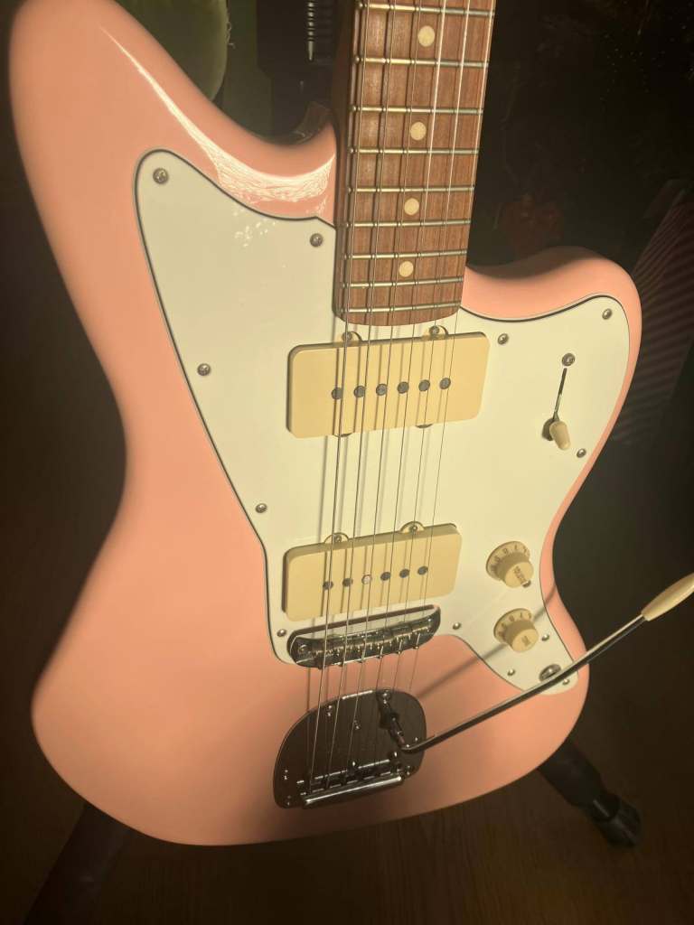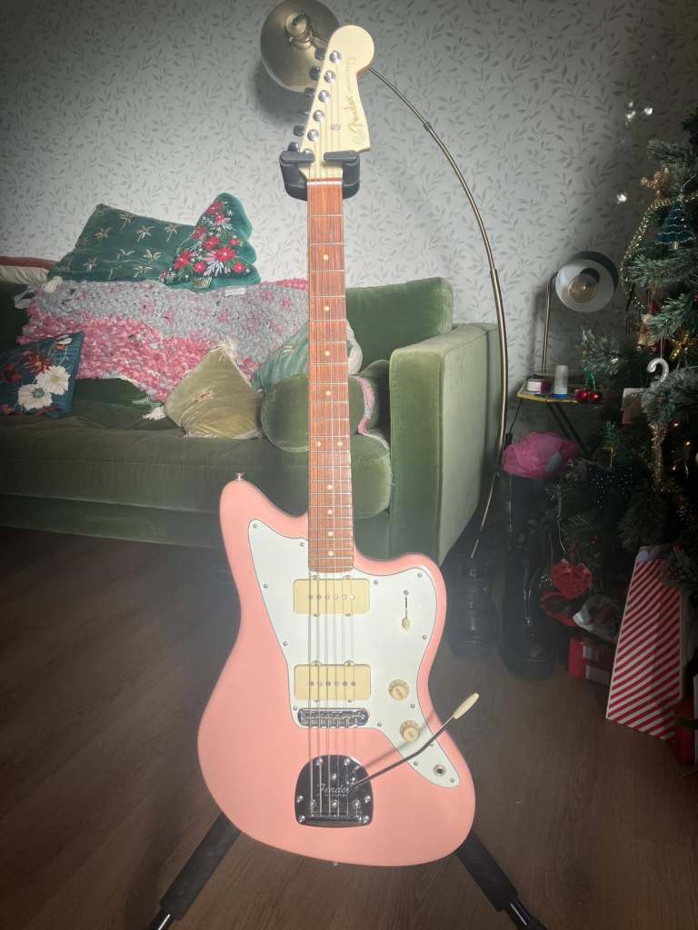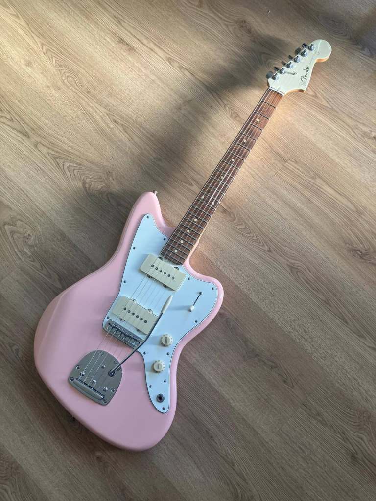 Limited edition guitarguitar pink Jazzmaster with cream headstock. This is a Mexican Player series guitar with American Pure Vintage 65 Pickups and a four-way pickup selector which allows series and parallel switching options. 9.5 inch fretboard radius. According to guitarguitar only 25 of these guitars were made for the European market.