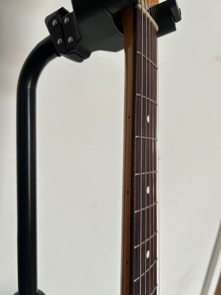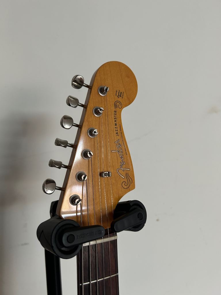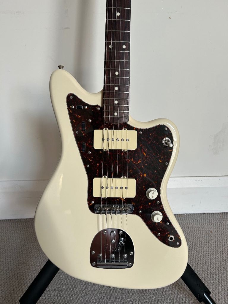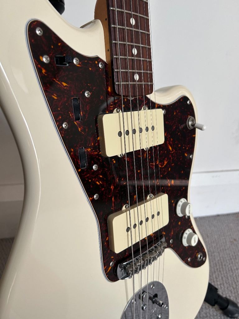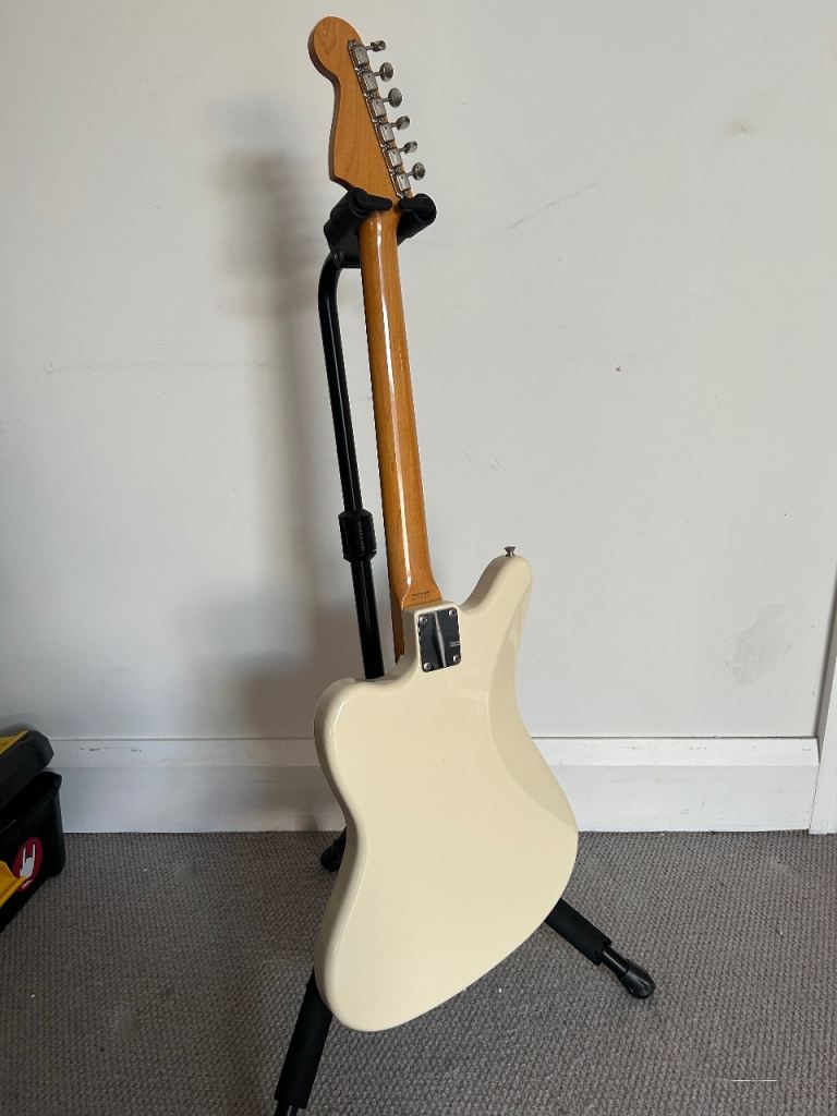 Spec: Alder body Maple neck with Rosewood Fingerboard 21 frets 2x Fender Jazzmaster single coil pickups 3-way pickup selector 1x Master Volume Control 1x Master Tone Control Rhythm circuit with master volume and tone roller controls Vintage Jazzmaster floating bridge and tremolo system Vintage kluson style tuners. Comes with padded gig bag.