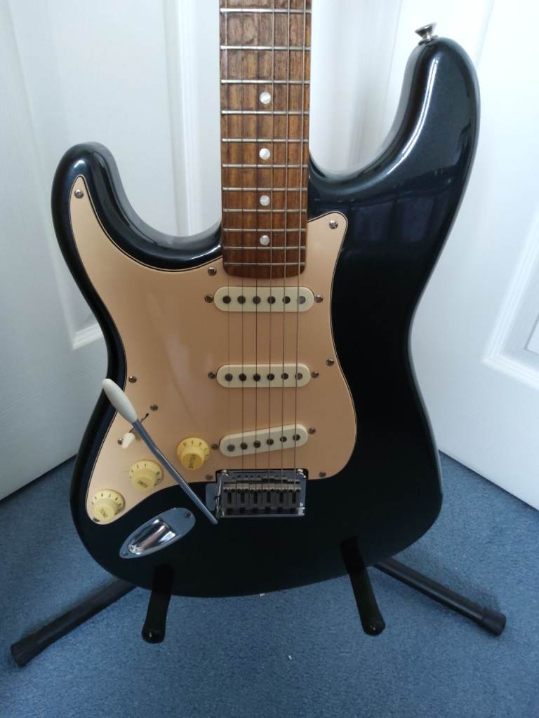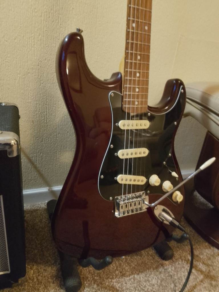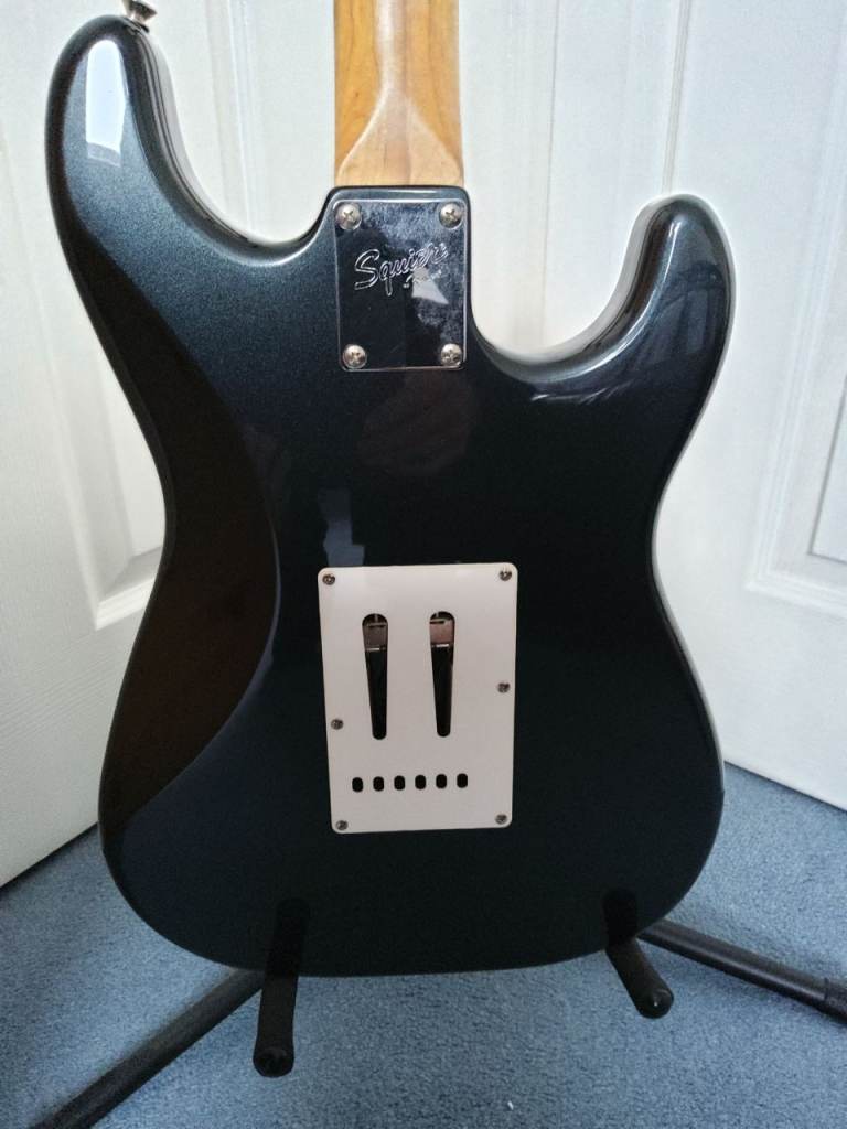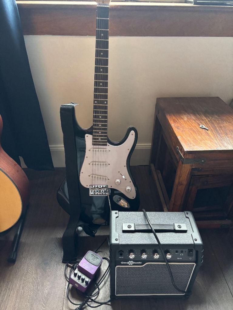 Fender Squier Stratocaster, Black Left Handed, with stand and padded gig bag, 30 watt Marshall amplifier, music sheet stand, guitar lead and plectrums. Everything to start playing guitar. Guitar is virtually unmarked and in good working condition. Ideal for someone who's left handed and either wants to start playing or continue playing guitar.