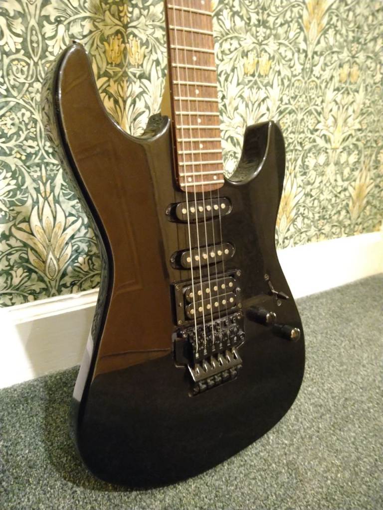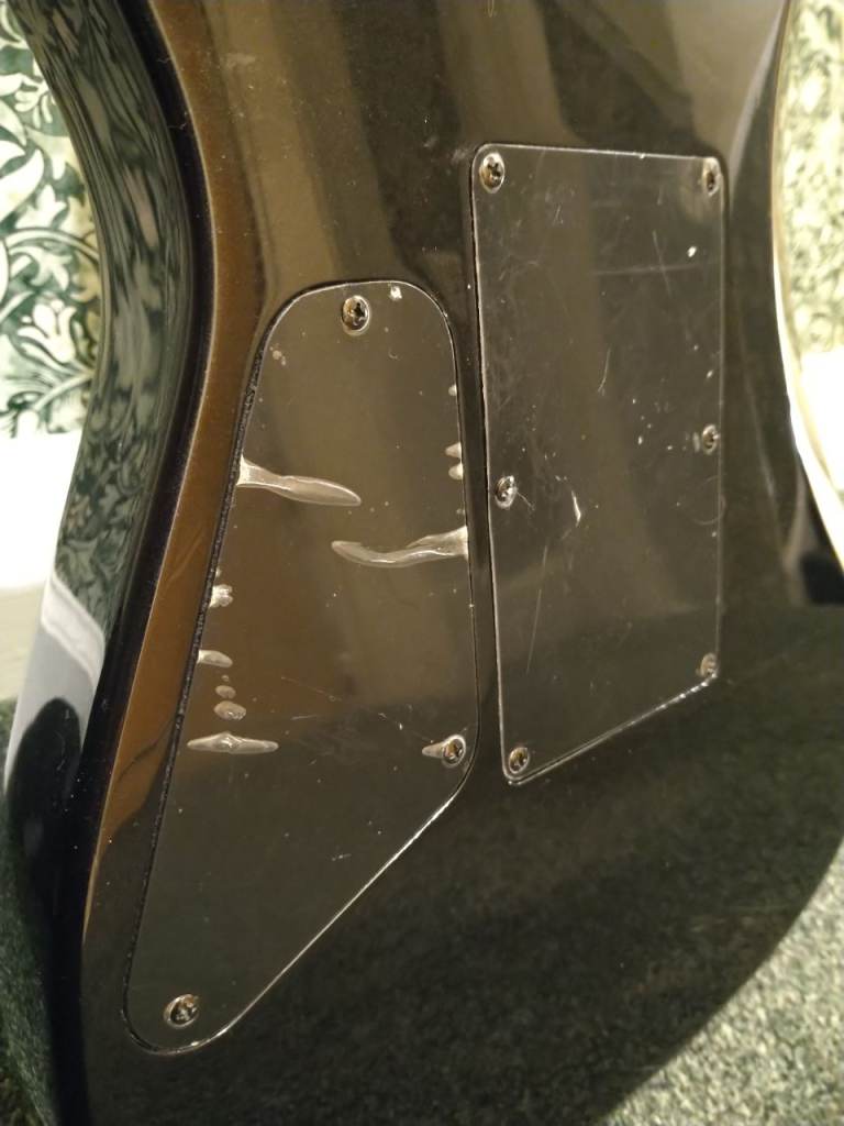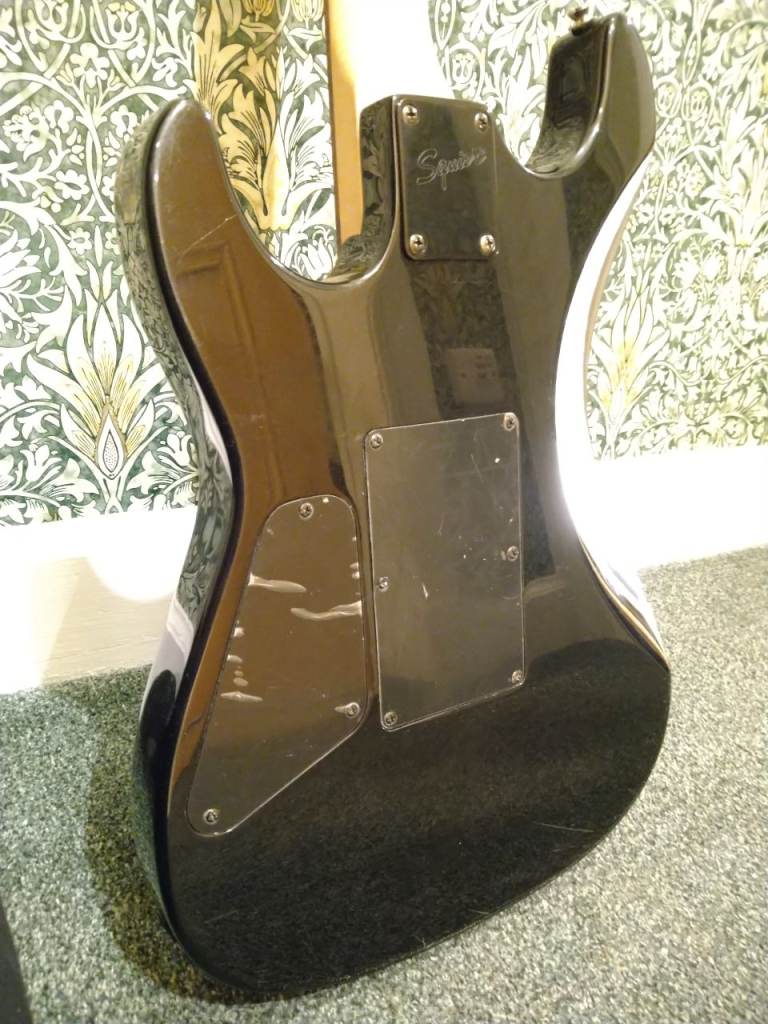Sparkly black electric guitar, still has plastic on the back on the back panels. Missing the high E string, can be restrung if buyer wants before purchase.