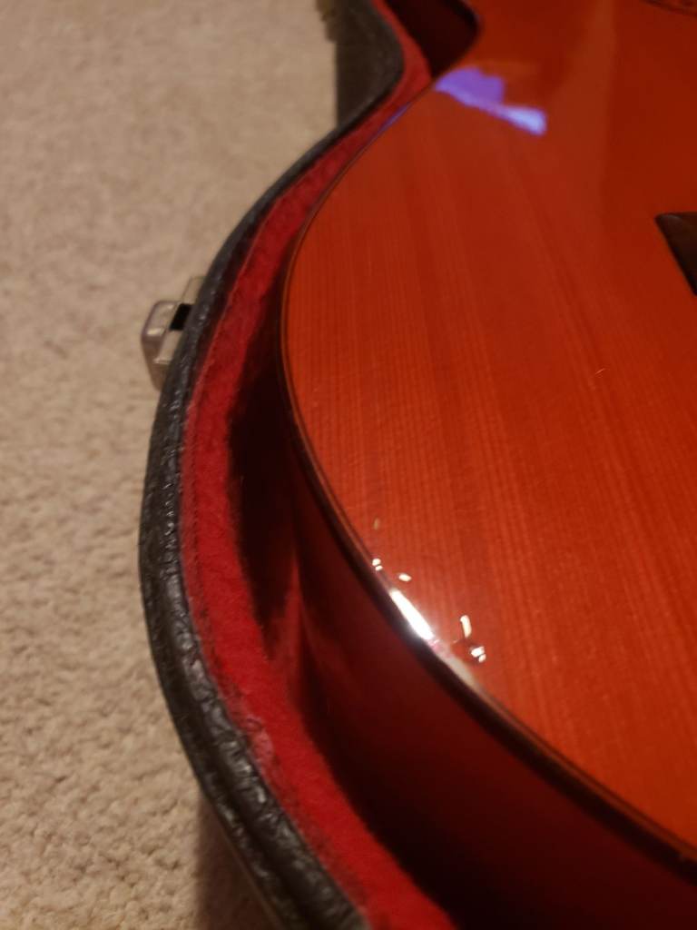 Solid top Cedar, cocobolo back and sides.