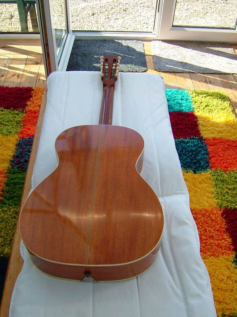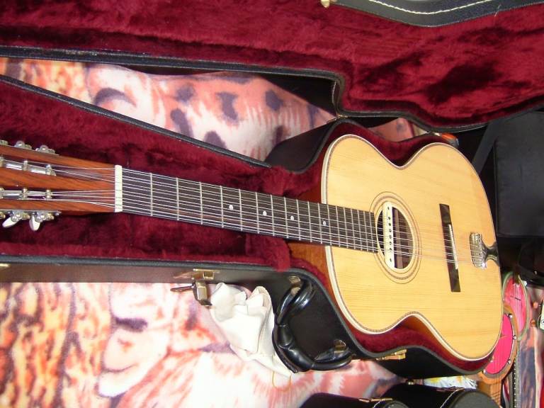 Made by Todd Cambio a luthier based in Madison, WI. who specializes in recreating some of the classic, early 20th century guitars from makers such as Lyon & Healy, Larsen Bros., Regal, and the like. The Francesca twelve-string reproduces the tone and feel of one of the most sought after twelve-strings of all time. It is an auditorium-sized instrument, based on the classic ladder-braced Oscar Schmidt designs of the early 20th century. With it's long baritone scale, it is tuned down 2 or 2-1/2 steps, to as low as B in the bass!! The combination of body size, tuning and ladder-bracing creates a huge, brawny sound .