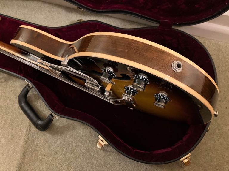 Gibson Custom Shop ES-339 (ES-3399) from 2010 in vintage sunburst with the fitted Gibson CS case and candy. This Custom Shop guitar is in excellent, near-mint condition with no breaks or buckle rash, but has an area of blemished / surface-cracked varnish near the headstock and the case lid is missing the retaining strap. The neck has the '59 rounded profile and pickups are '57 Classics. Guitar weight is around 7.2lbs. The guitar comes with the COA plus tools and a Gibson polish cloth. Collect from Hartland, Devon.