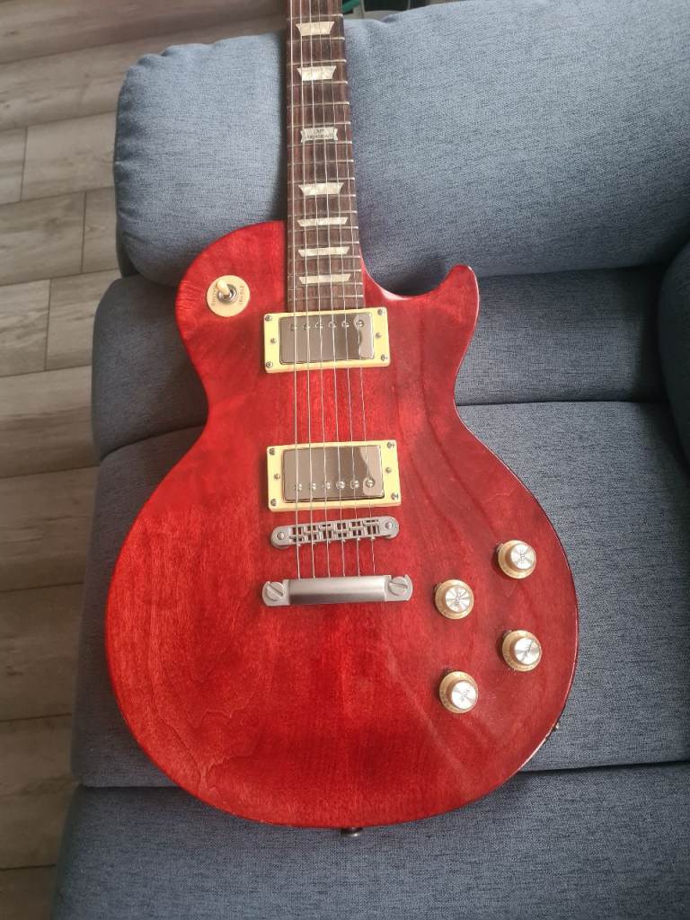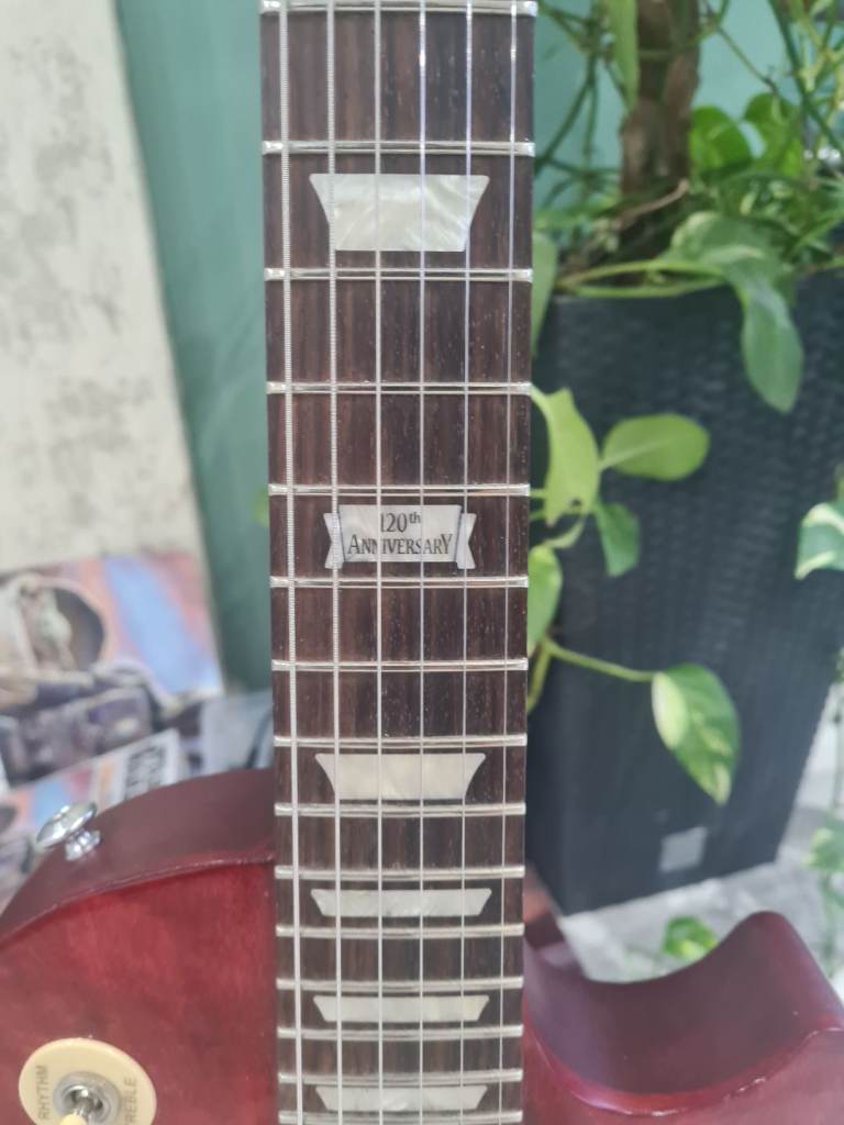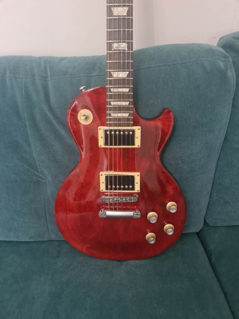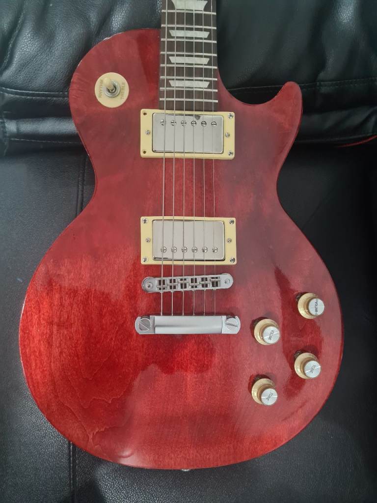 For sale is my beautiful Gibson LPJ 2014 120th Anniversary Les Paul in Cherry Red with cosmetic uplift - clear gloss lacquer to lift up the looks, cream plastics, gold top hat bell knobs, added 4 x knob pointers, and nickle humbucker covers added. Additionally, I've polished frets and lemon oiled rosewood Fingerboard and given a good low action setup. Comes with Gibson padded soft case and black plastics and knobs from previous life as shown in pic.