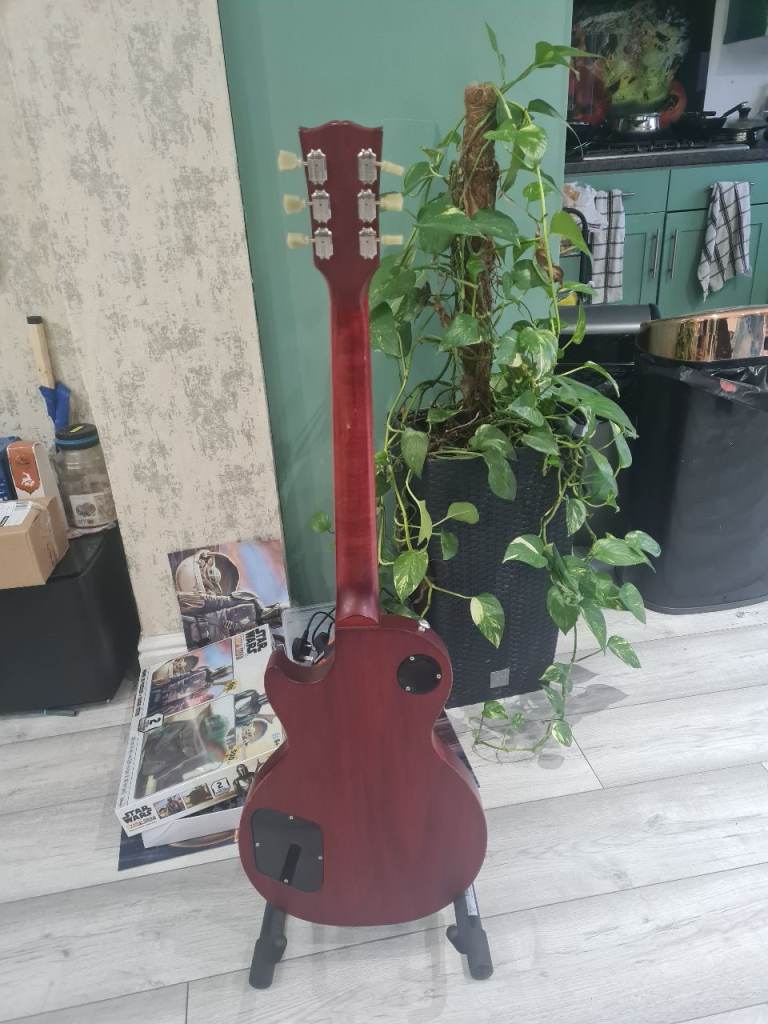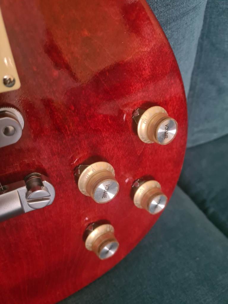 The guitar is otherwise all stock, great sounding Gibson '61 zebra pickups underneath the covers, Gibson Quick Connect solderless wiring harness PCB, Gibson Deluxe tuners (one of them is slightly bent but works absolutely fine).