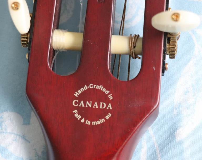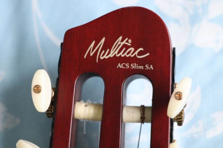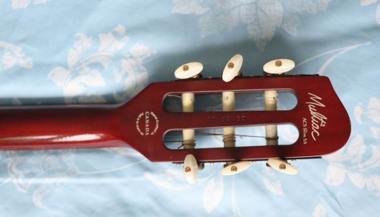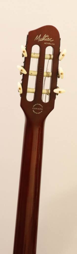 “The ACS is actually a solid body nylon string guitar. Although the body is chambered, the combination of basswood capped with light maple is more typical of a solid body design… The slight 16” radius on the fingerboard makes this guitar very comfortable in the hands of those who spend most of their time playing steel string instruments.” The “slim” in the model’s name refers to the neck width, here the narrow neck (1.375”) is slightly narrower than a standard Stratocaster (1.6875”) further enhancing the playability for Strat players.