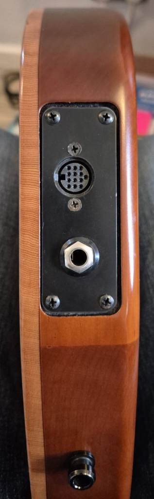 According to Godin, “The Multiac… not only produces superb amplified sound [via a conventional 1/4” jack], but also produce a hexaphonic output through a 13-pin connector, which provides these guitars with direct access to Roland TM GR-series synthesisers… The ¼” phone output works with a regular guitar cord. The 13-pin connector provides hexaphonic output (a separate signal for each string) that is compatible with a number of guitar synths.”