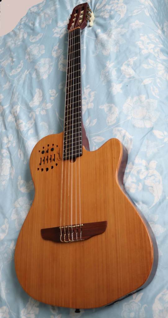 This beautiful example of the Godin ACS Slim Multiac SA Nylon electric guitar in natural cedar with conventional Roland guitar synth/midi Pickup does not come along too often. That’s because this instrument is in pristine condition, never gigged or even taken out of the house. The price includes the original gig-bag.
