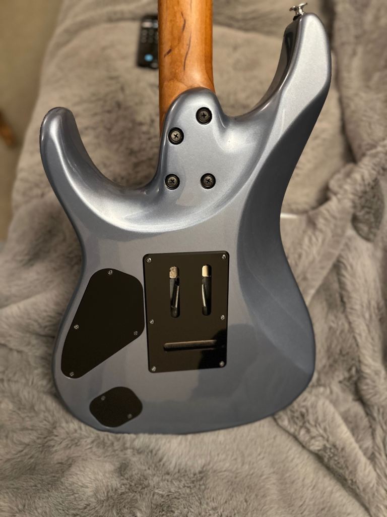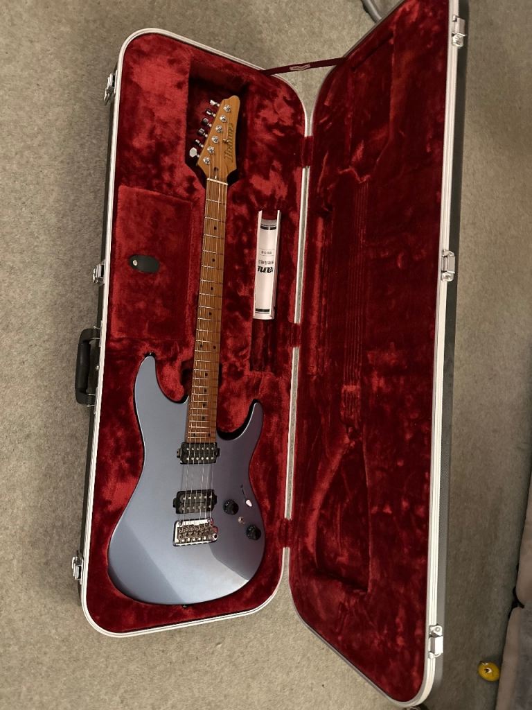 HH pickup configuration with Seymour Duncan Hyperions, Gotoh 2 point trem with titanium saddles, comes with bar, I put a white switch tip on it and lost the black one but that's not a big deal. Gotoh locking tuners. A beautiful roasted maple neck with luminlay side dots.