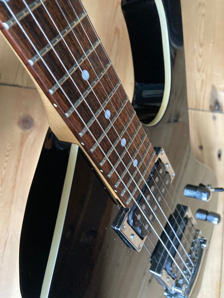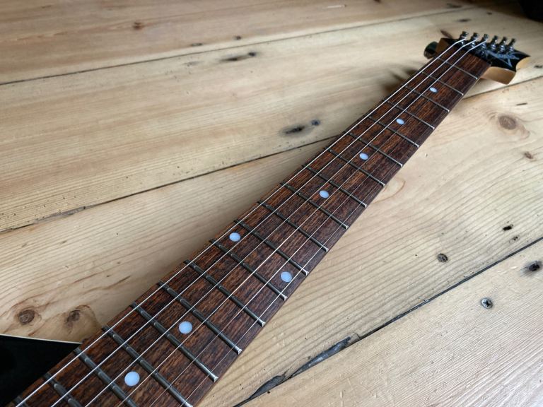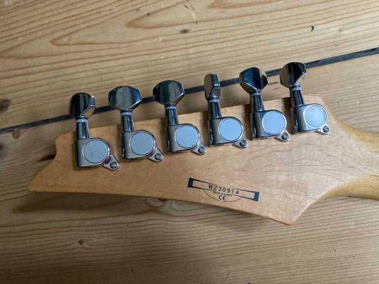 The frets are in good shape overall with some light playing wear. The body is basswood married up with a Maple neck.