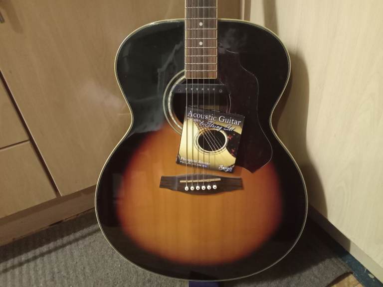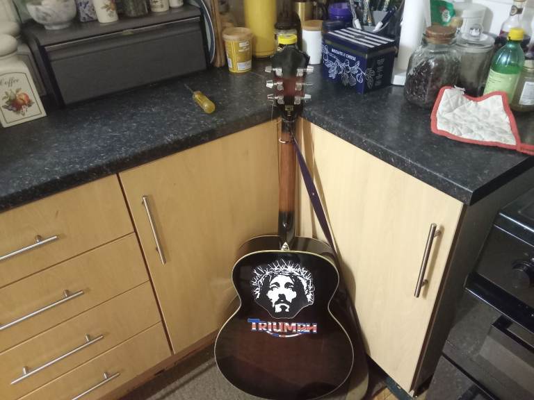 Plays well. Across the hole pick up and jack fitted, all working. Needs restringing, set of strings included. Stickers on back can be removed easily if required.