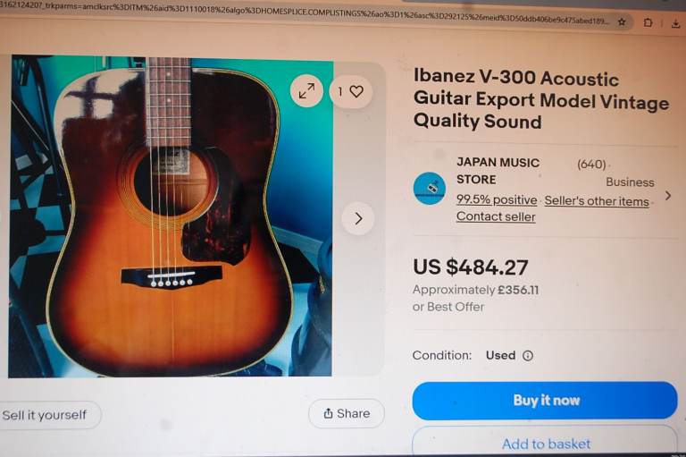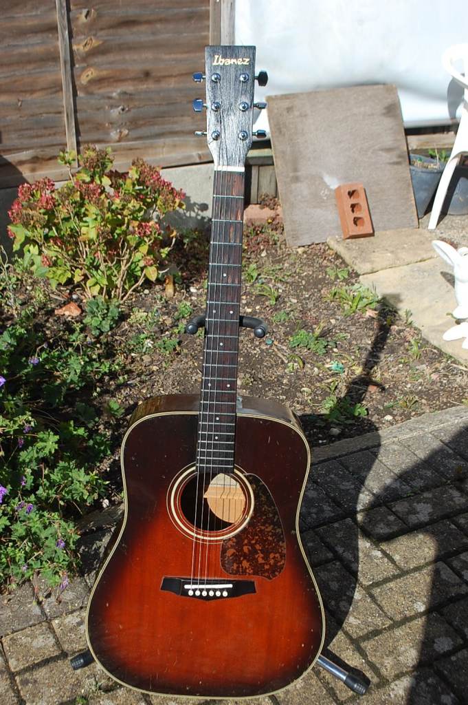 IBANEZ MADE IN JAPAN ACOUSTIC GUITAR HACTINGAND BUILT TO EXACTING STANDARD IN JAPAN MODEL NO V300 TV THE NECK WAS BROKEN AND REPAIRED, MAKES NO DIFFERENCE TO THE SOUND OR PLAYING THE GUITAR COMES IN A SOFT CASE, THESE AE SELLING ON EBAY FOR £484
