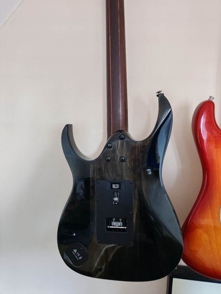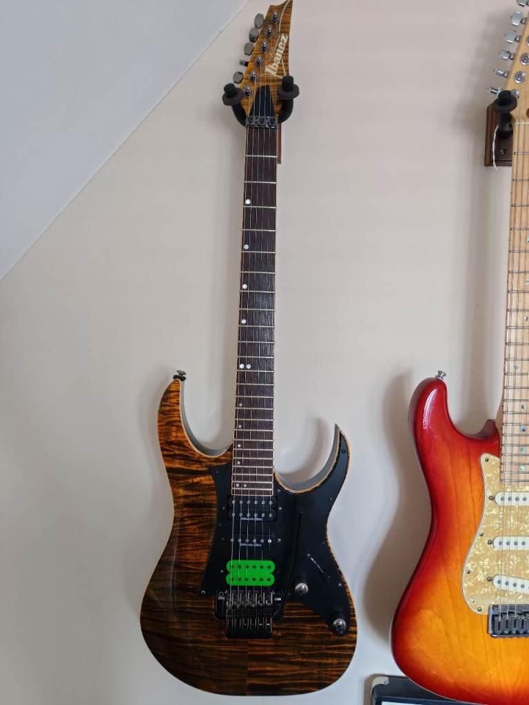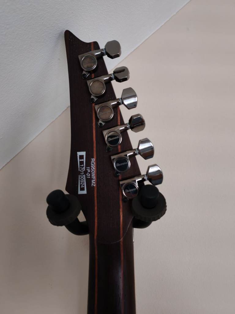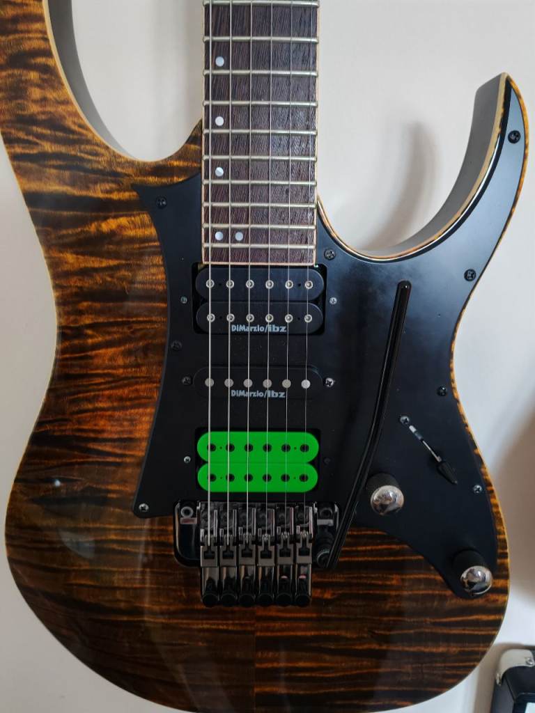The Ibanez RG950WFMZ Premium model in Tiger Eye features DiMarzio IBZ Pickups.