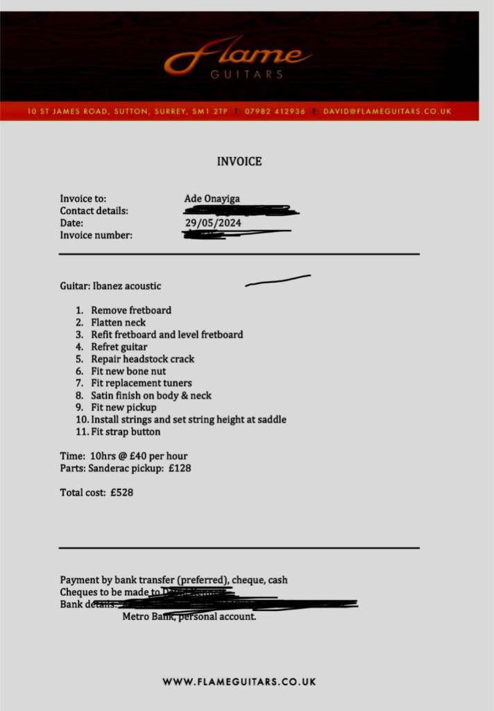 invoice for the work carried out on this guitar. The pickup