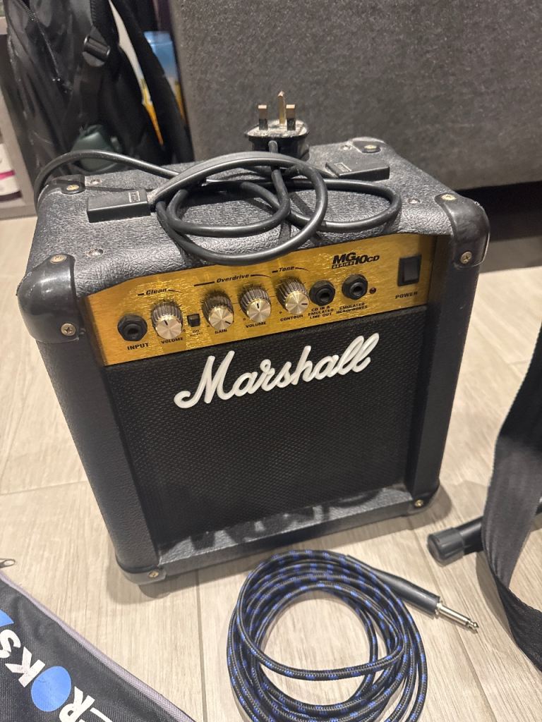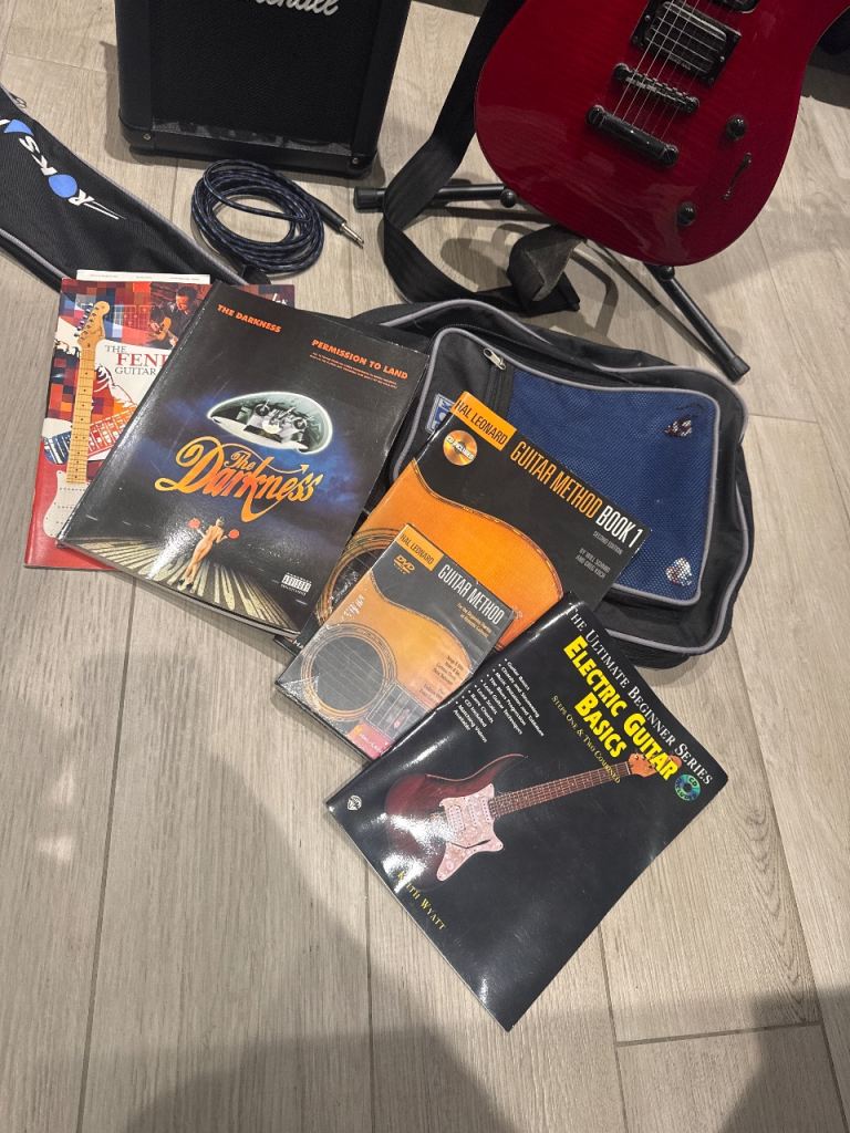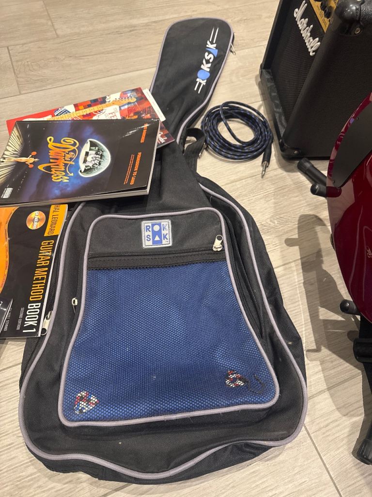 Bright red Kramer electric guitar with wood effect. Marshall MG series amp with cable. Carry travel bag, picks, 4 guitar books and the guitar stand. Great condition barely used, didn’t have the patience to learn to be honest