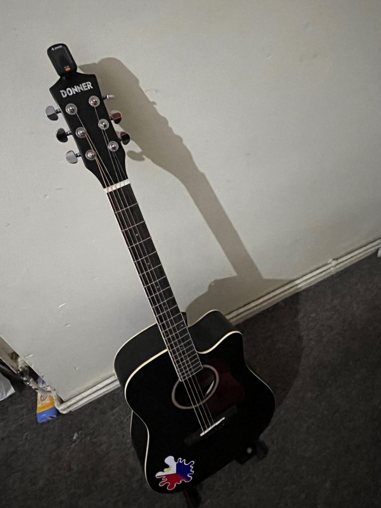 BLACK RIGHT-HAND ACOUSTIC GUITAR KIT:Donner acoustic guitar kit includes acoustic guitar, padded gig bag, strap, digital clip-on tuner, capo, pickguard, extra pack of string, 4 picks, clean cloth and Allen wrench. Comes with all necessary accessories beginners need. A great gift for festival day and birthday!