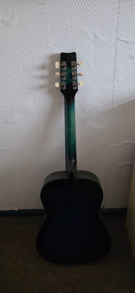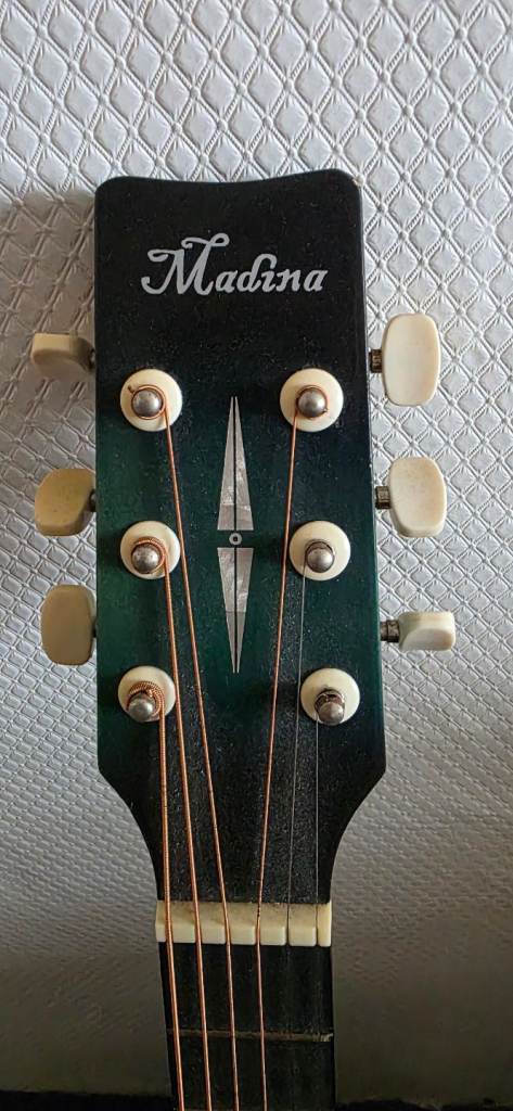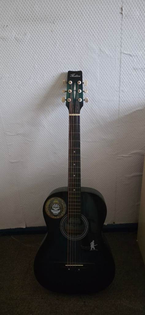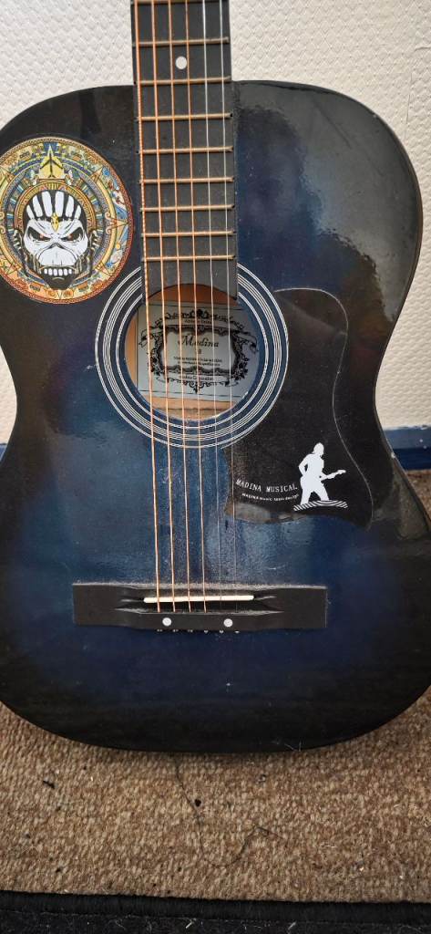 Madina acoustic guitar features a glossy blue finish with musical-themed graphics on the body and near the soundhole.