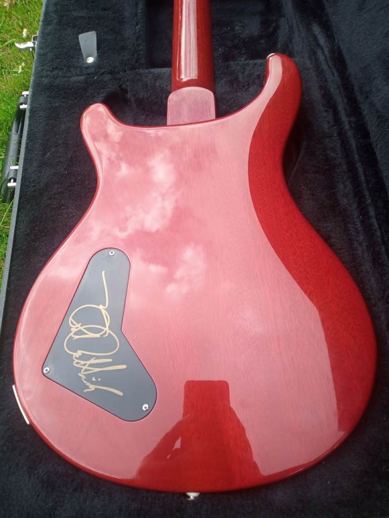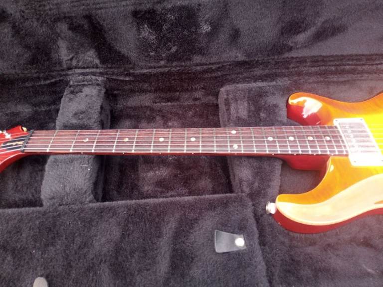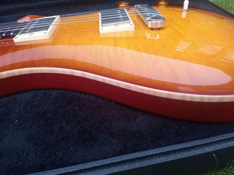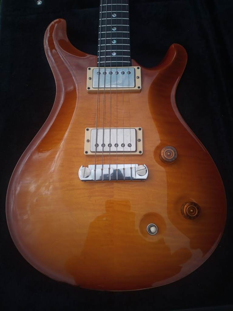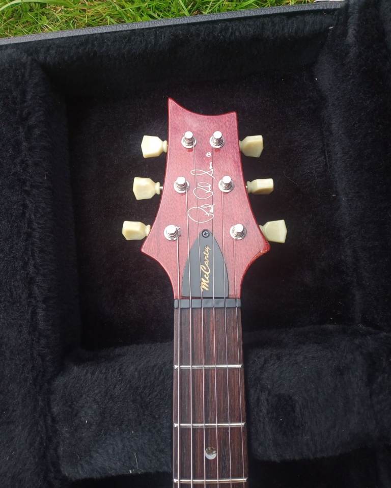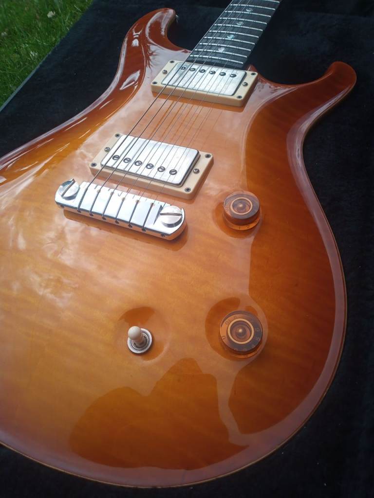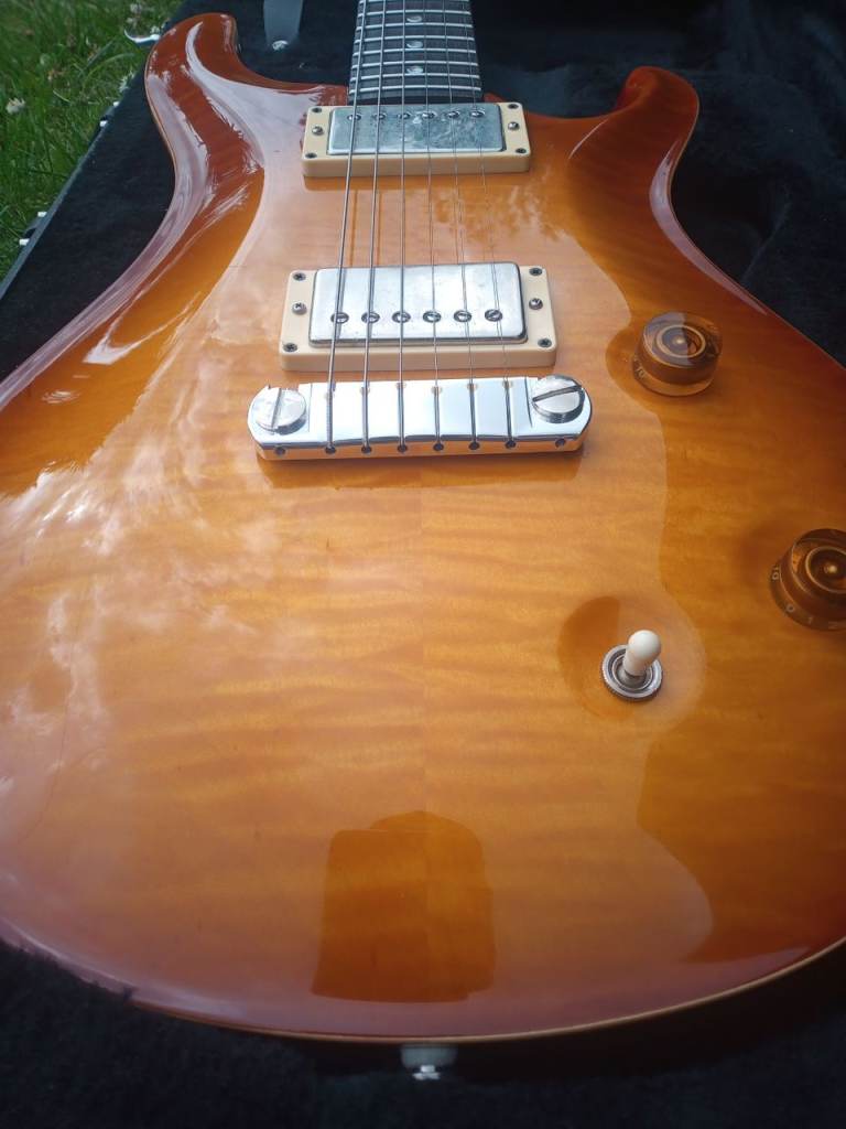 Up for sale I have a 1999 PRS McCarty guitar. As you can see from the pics, the maple top is stunning. The guitar has a figured rosewood fingerboard with MOP/Abalone crescent moon markers. This guitar is all original apart from the upgraded PRS bridge with brass inserts. The back cover plate has been signed by Paul Reed Smith himself. As you would expect from a guitar of this age, there are a few minor signs of wear. As with all American made PRS guitars, it plays and sounds great. Mail through gumtree if interested.