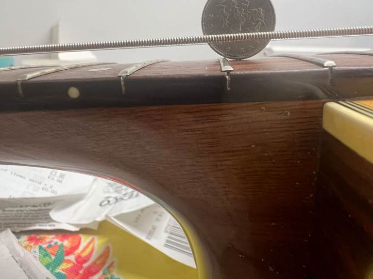 photo of a 5p coin at 12th fret), so the guitar would require a service