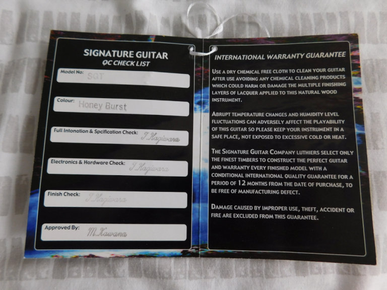 SIGNATURE GUITARS - JAPAN - SQT - QUILTED MAPLE - HONEYBURST - ORIGINAL SWING TICKET FOR QUALITY CONTROL