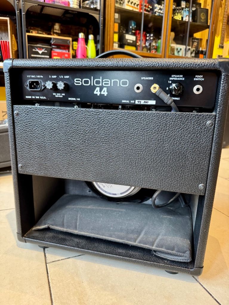Soldano Model 44 combo featuring 50-watts from a pair of 6L6 tubes through a single Eminence 12" speaker for a rich and powerful sound. The onboard reverb sounds great and the two channels share EQ and pre-amp gain control with separate master volume controls for the "Normal" and "Lead" sounds giving you the option for a substantial lead boost with an impressive amount of headroom. This amp is in great condition with hardly a scratch on it and it's built like a tank so it is sure to last.