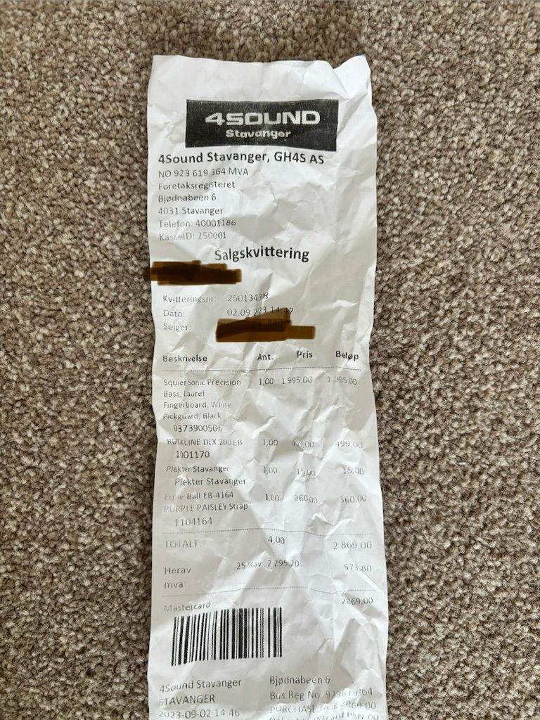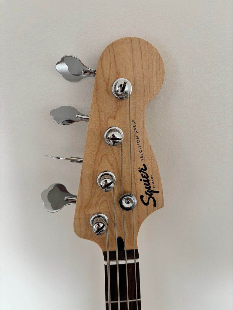 As-new condition beautiful Precision bass guitar, made by the budget brand of Fender, Squier. Very solid choice for beginnners and intermiediate players. Used only a couple of times since it was bought in Norway in Sep 2023 (see receipt).