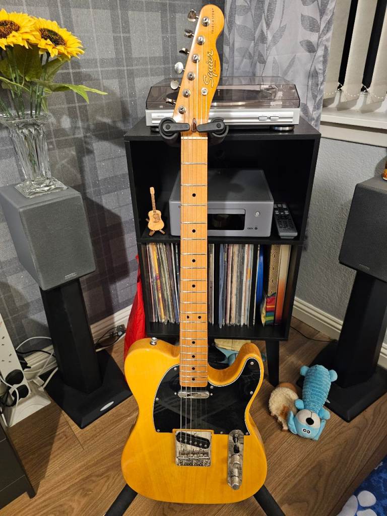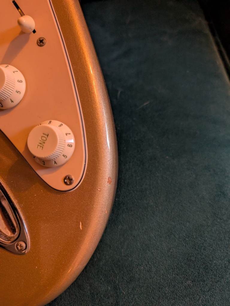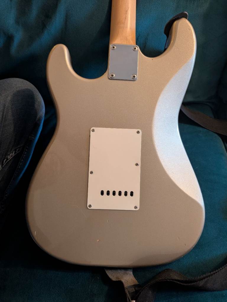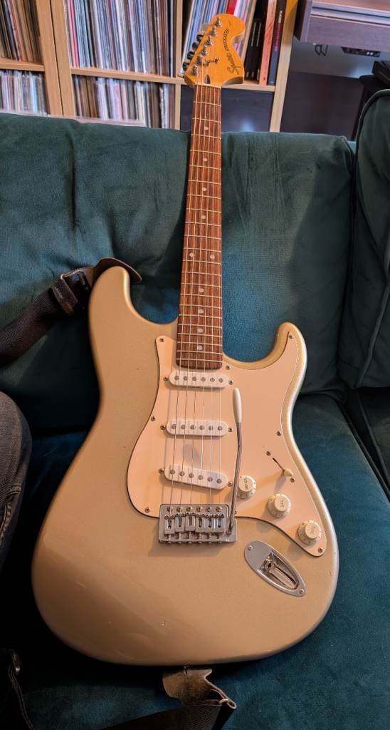 Squier Stratocaster standard from 2000 in shoreline gold. Not a common colour that in some lights looks almost like a metallic silver.