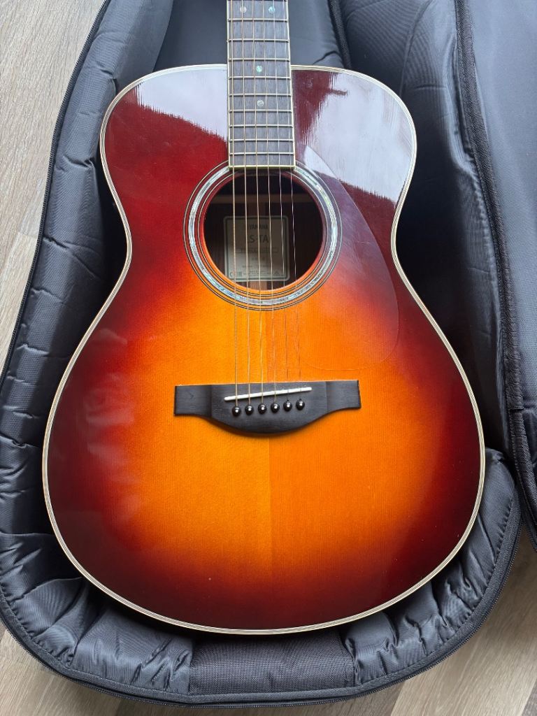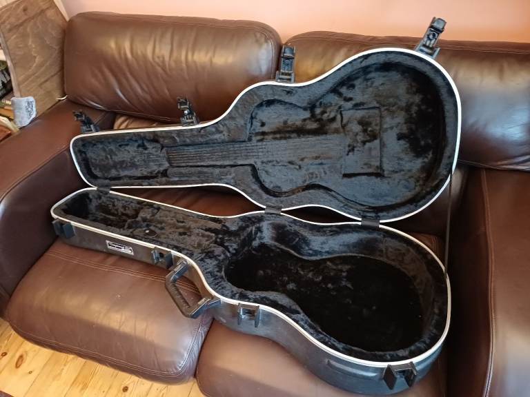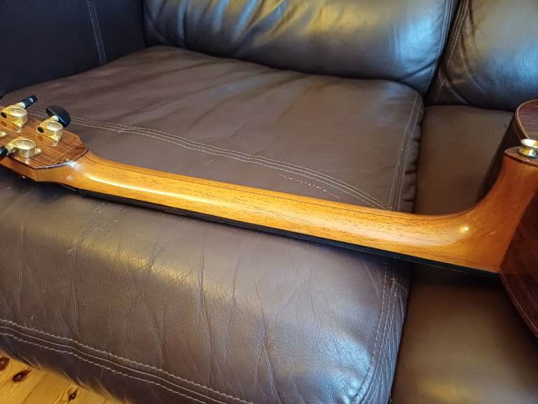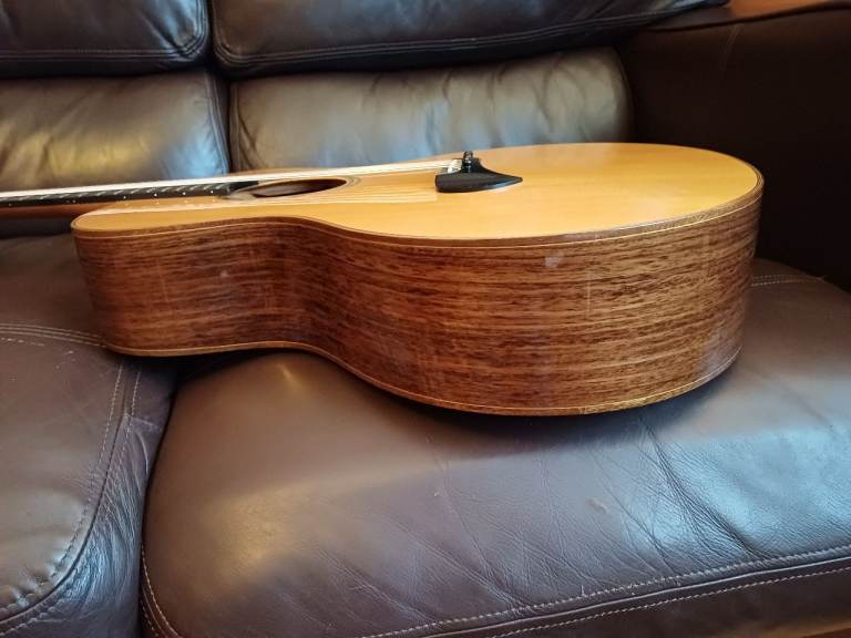 It’s been kept indoors with great care (not gigged, I mean) and comes with a custom-fit Tanglewood hard case. The guitar is in very good condition and has some accidental minor dinks from light use on the top and one on the neck which are difficult to photograph, but if you would like some close-ups, email me and I can try to get the light just right to show them.