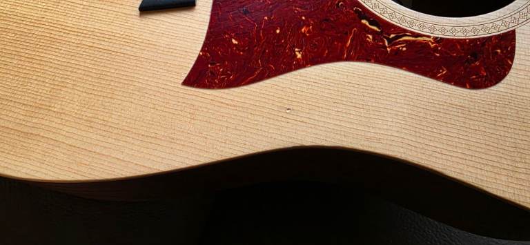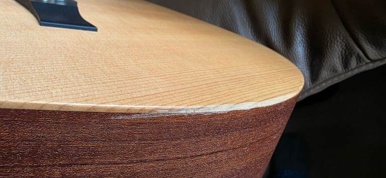 There is a light scuff at the top edge near where the right forearm would sit. There's also a small indent near the scratchplate area. Photos of both provided.
