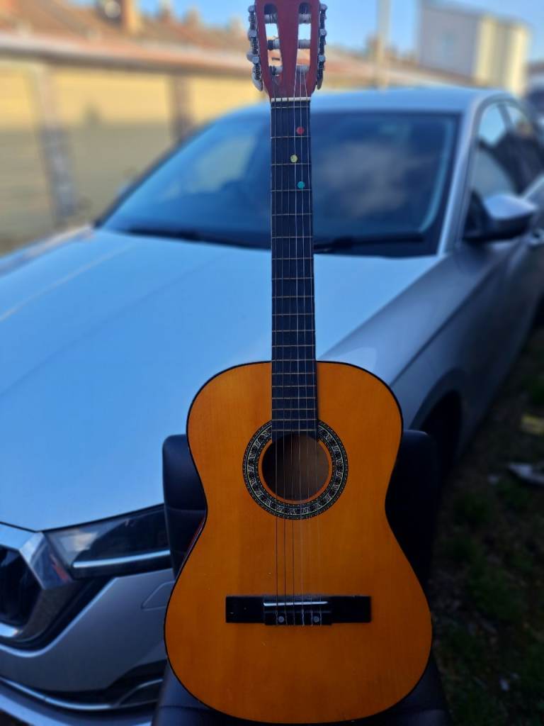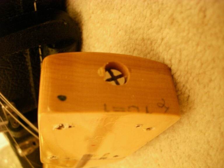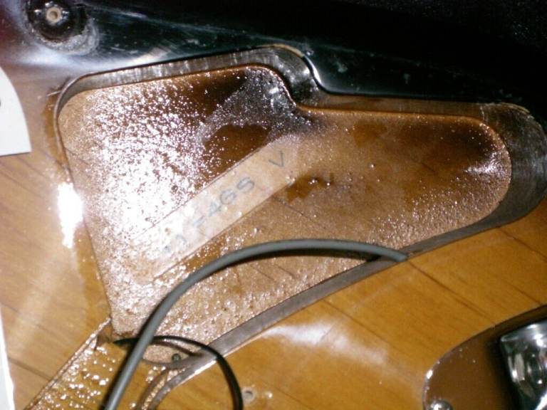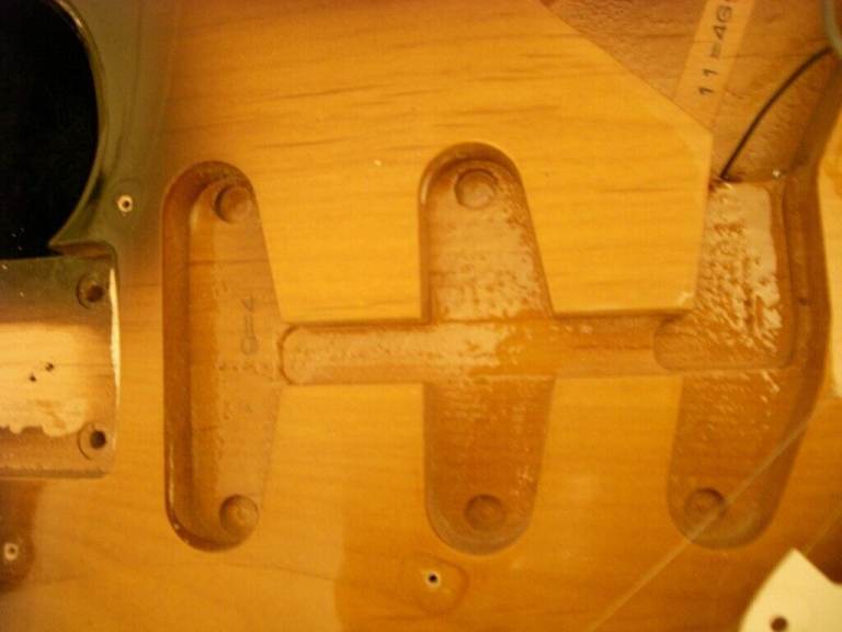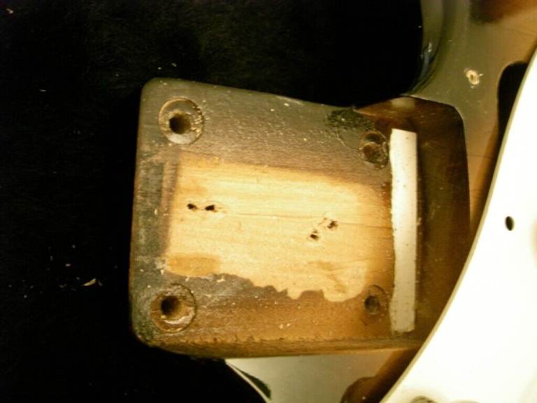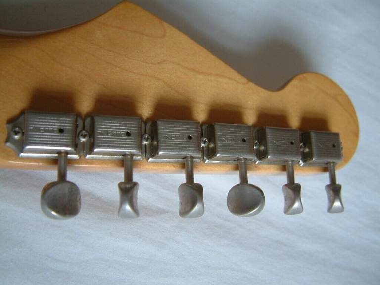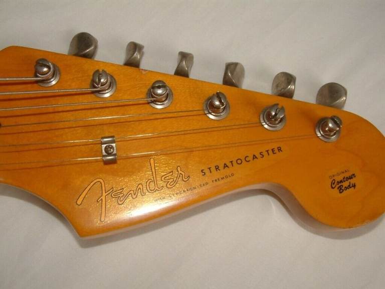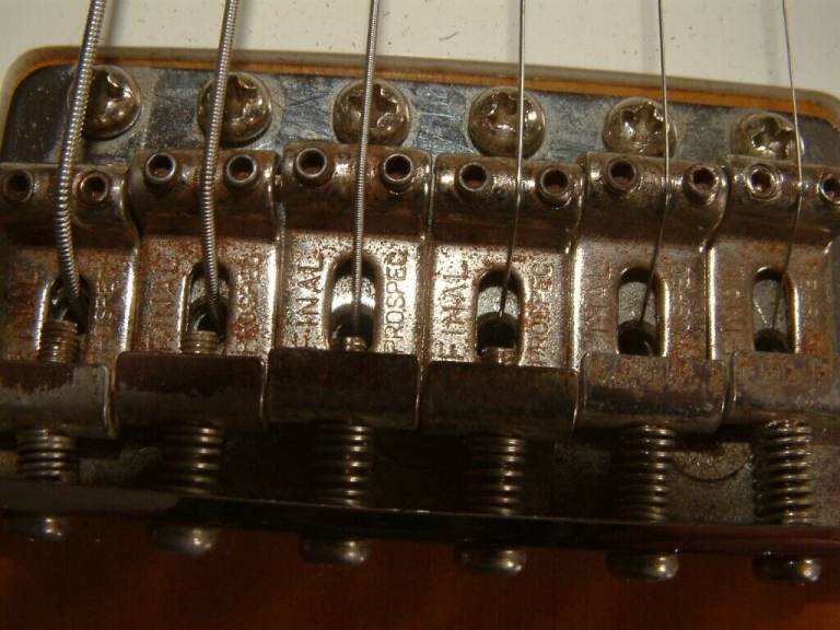 The original headstock logos have been removed and replaced with a Fender waterslide decal. Final Prospec steel saddles.