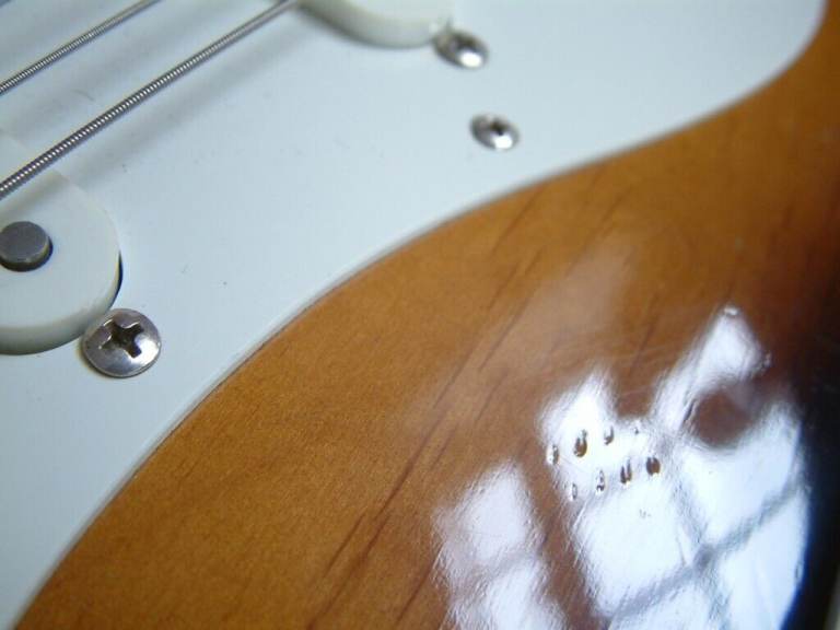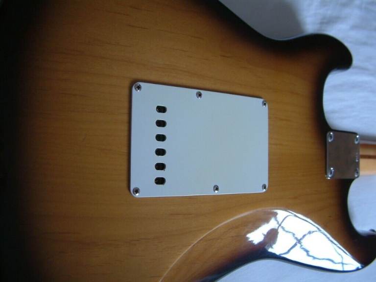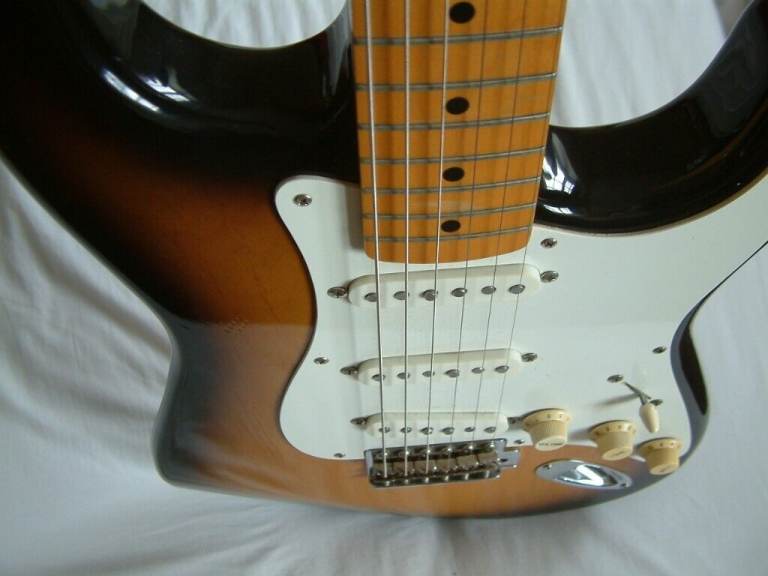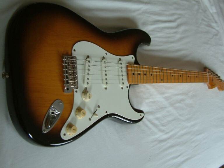 1956 to 1960 Fender styling with a bolt-on maple neck and fretboard and 2-colour sunburst.