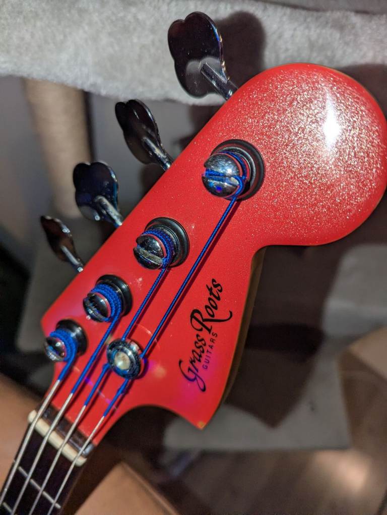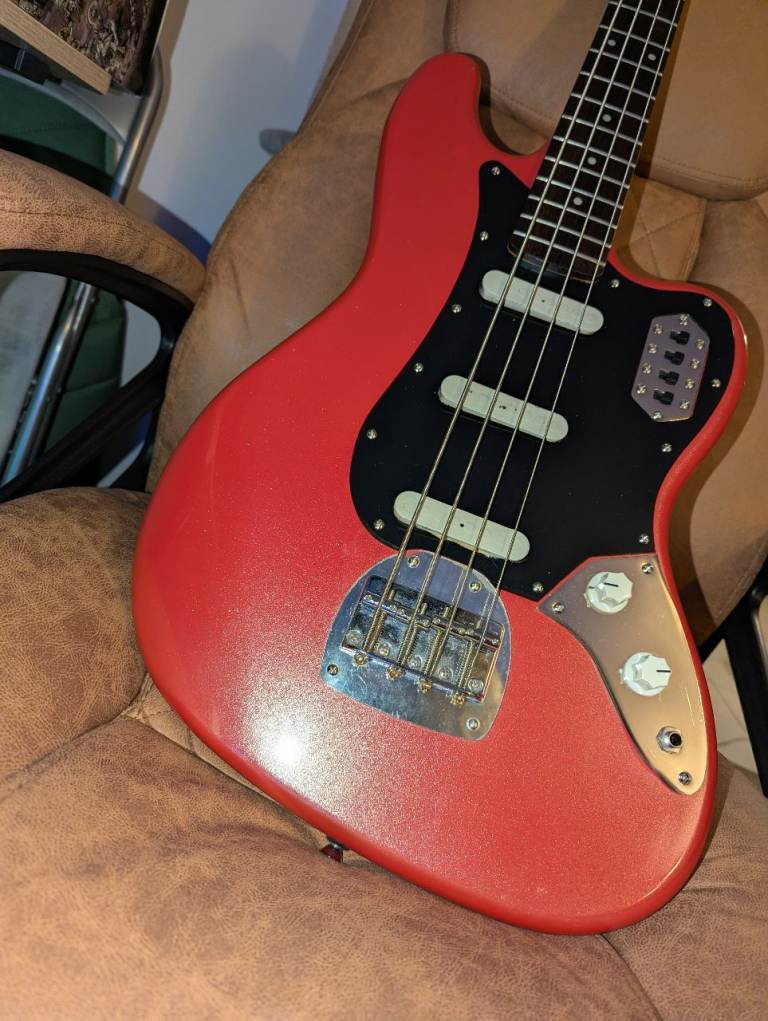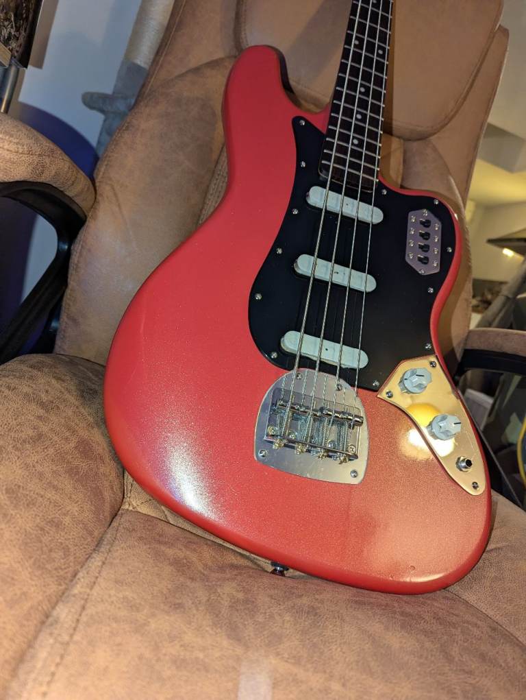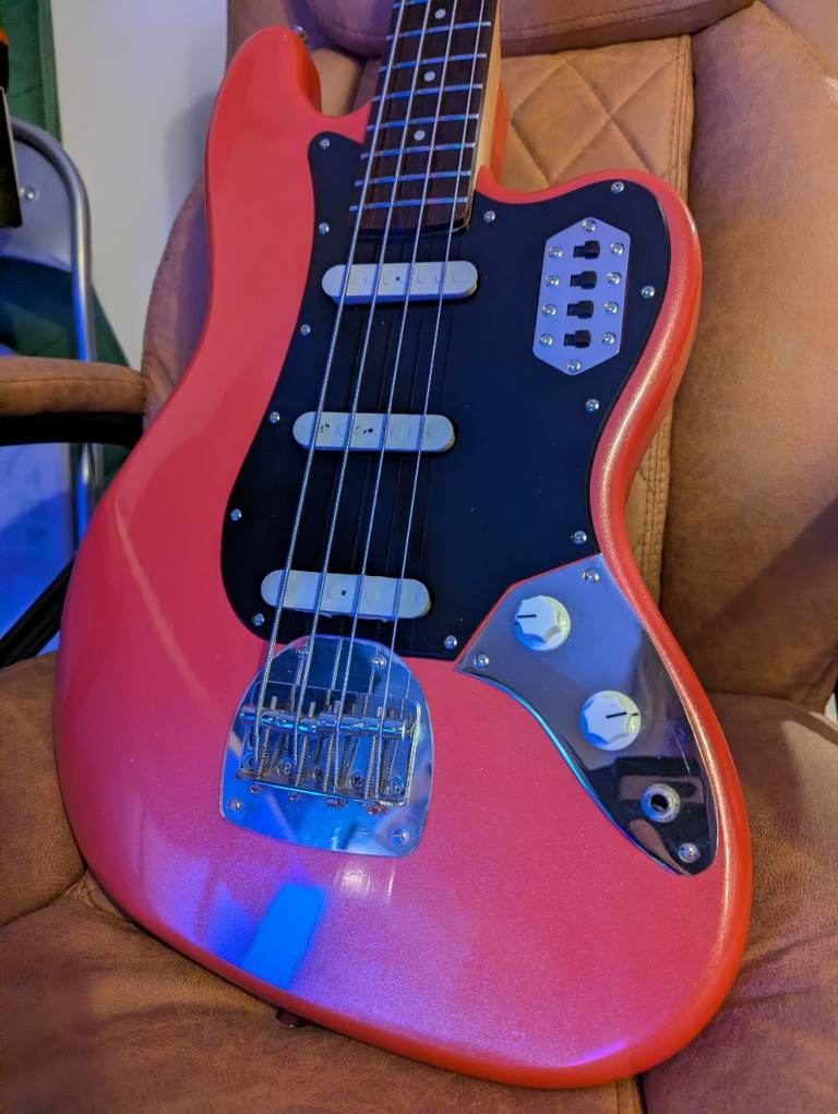 The setup is unlike any other bass - a Jazz Bass with three individually switchable pickups and a "strangle" (bass cut) circuit like a Fender Bass VI. The body is modelled on a Bass VI and finished in more of a metallic Fiesta Red with a subtle sparkle rather than the pink like the official finish name suggests.