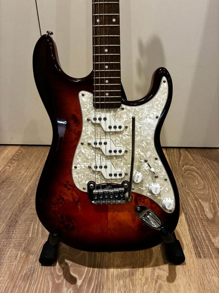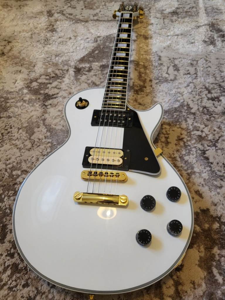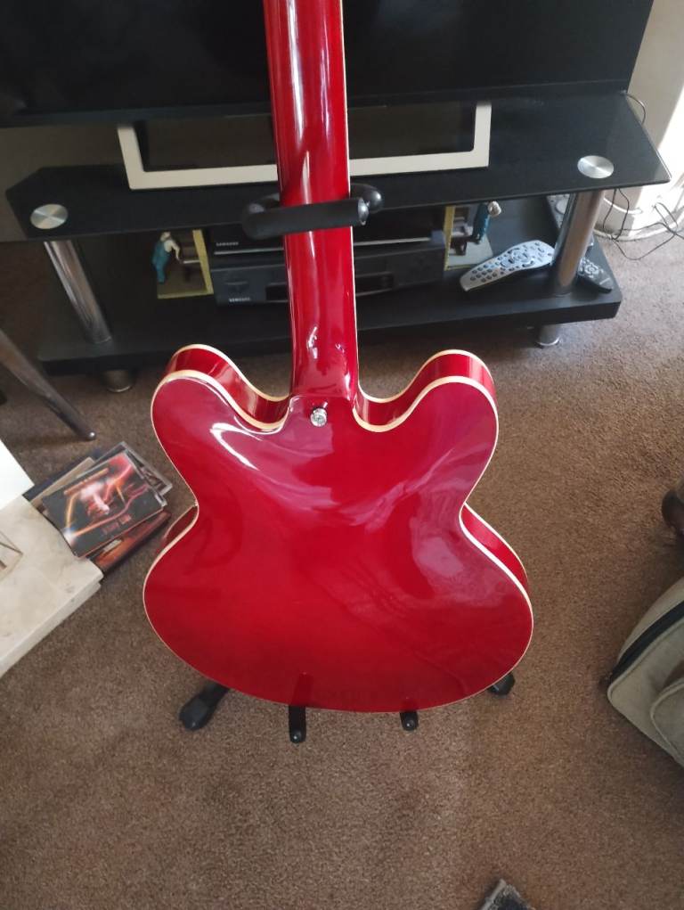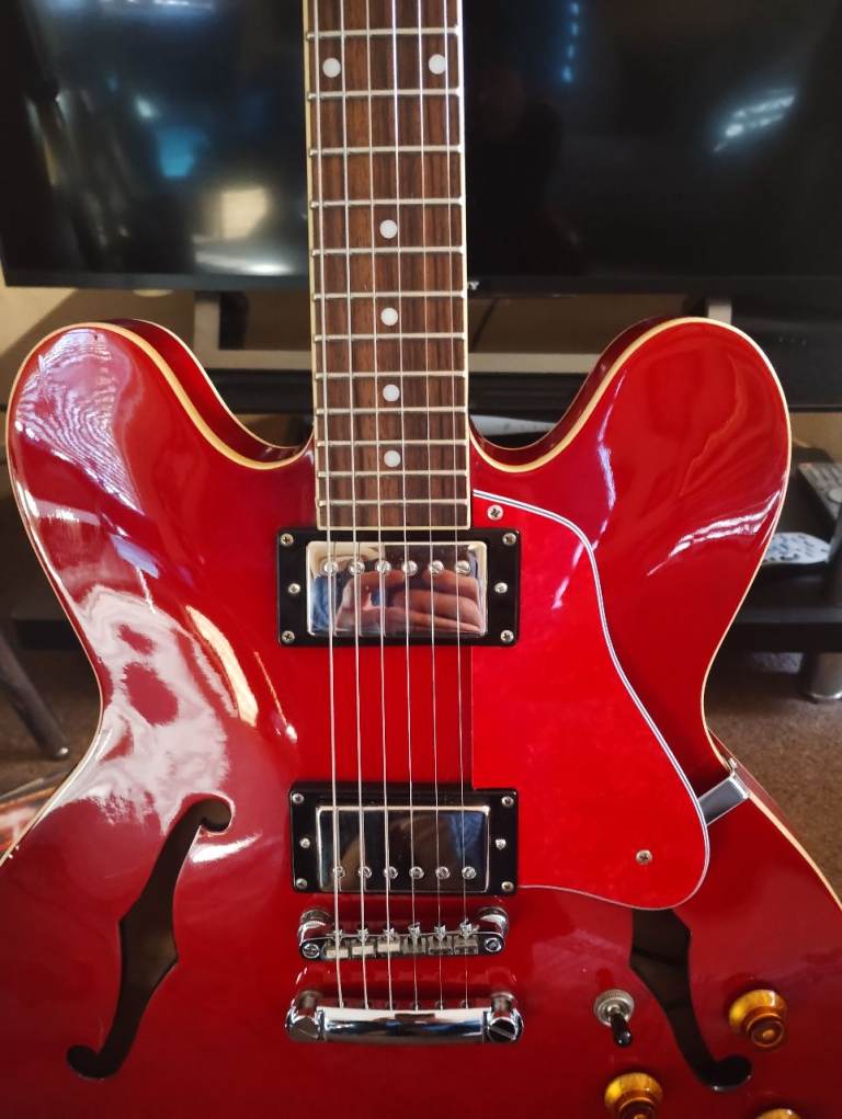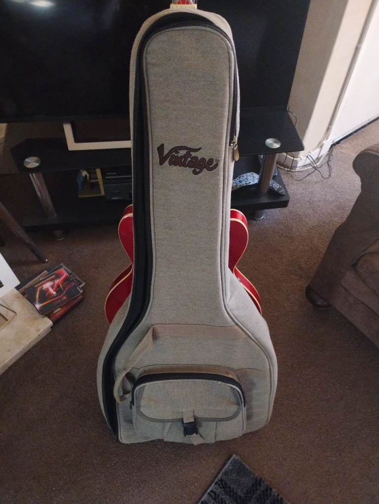 Hi , for sale: Vintage brand 535 335 style, this isn't the reissued model with the odd body shape, this is the original and correct shape. I have upgraded this with the following : Iron Gear Dirty Torque bridge and Blues Engine neck pick ups, I have replaced the pickguard and truss rod cover with a custom made set but the originals plus original pick ups are included in the sale along with a new Vintage gigbag. The guitar is set up with D Addario 9's and ready to go.