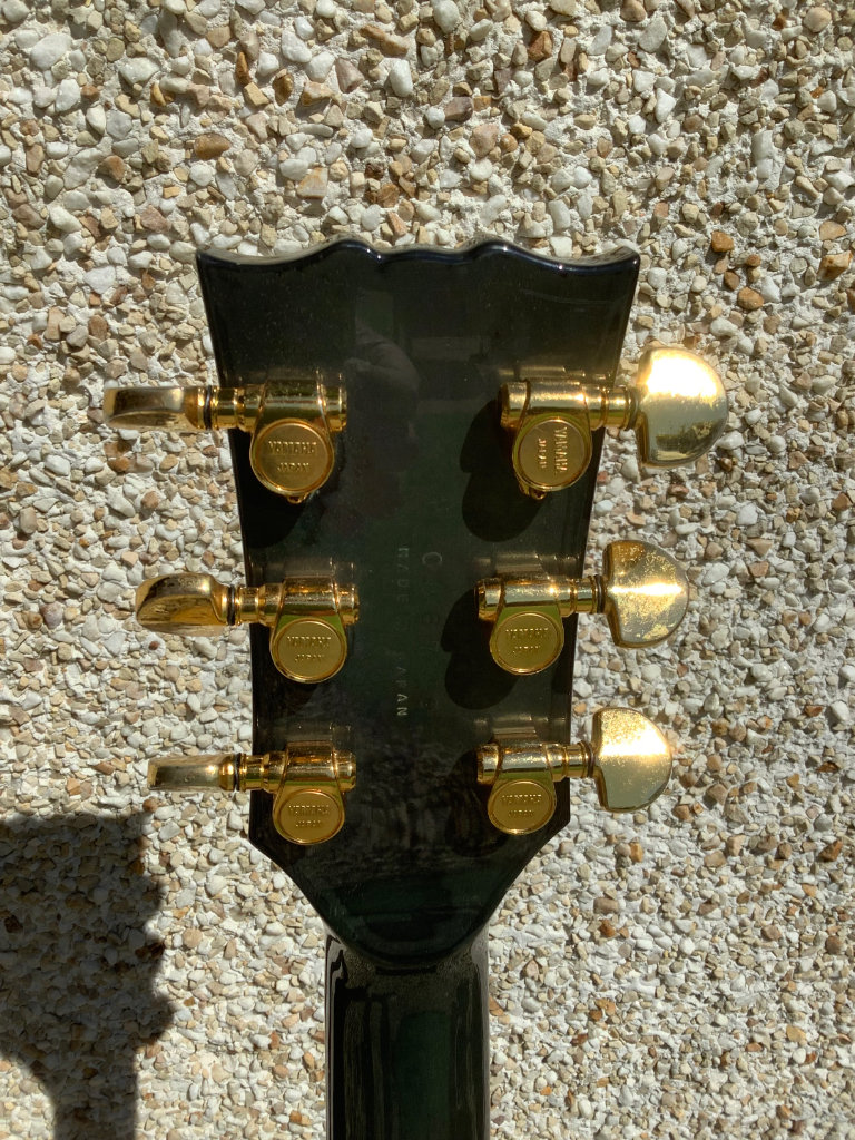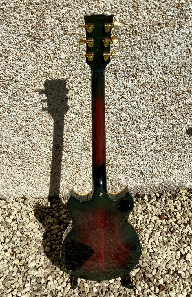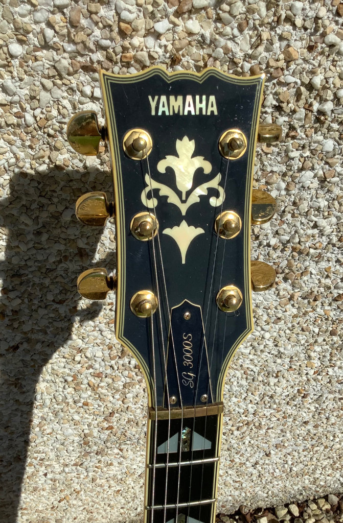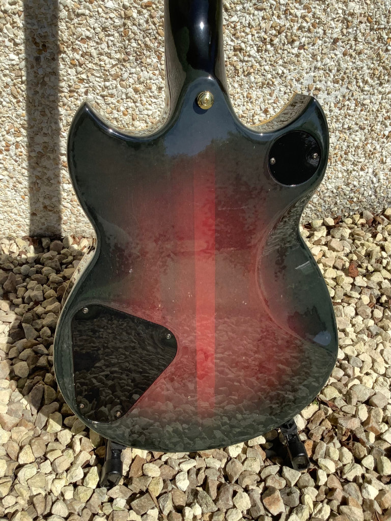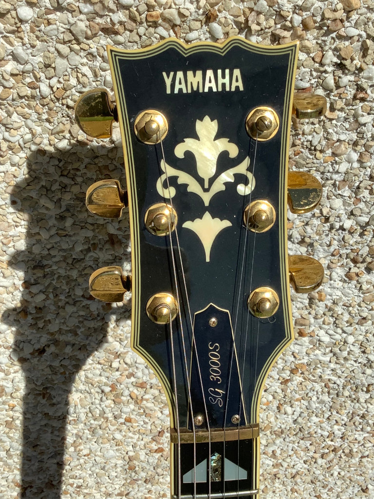 Rare 1983 Violet Burst Yamaha SG-3000s, top Yamaha SG model. Built with solid mahogany body, maple cap, and built with a thru body mahogany neck, and kitted out with a black ebony fingerboard. Ornate abalone split wing markers on a bound fretboard. 2 humbuckers and a 2 vol, 2 tone arrangement with a jack socket in the front. The body of the guitar is inlaid with abalone on the outer rim in addition to the binding. The electrics are accessible from the 2 cavities in the back covered by 2 black plastic covers. Guitar has been used but is overall clean on the body and neck and there are no breaks. Some faint fogging of the lacquer which is common in the SG models and minor tarnishing to the brass plated hardware