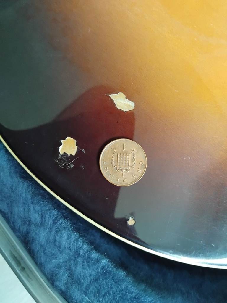 This guitar had a refret in 2007 by guitar guru Martyn Booth. He also wired it for coil splits via push push tone pots giving a nice additional variety of sounds. The frets are still fine and the electrics work perfectly.