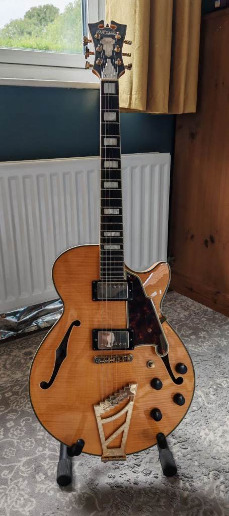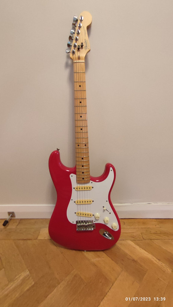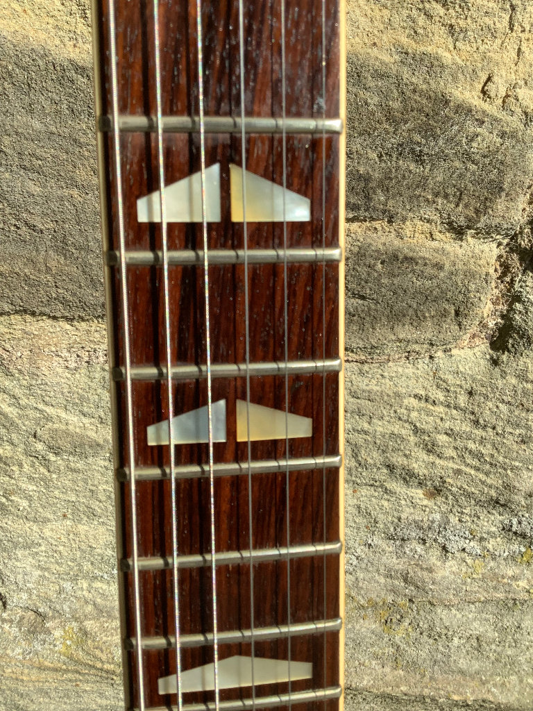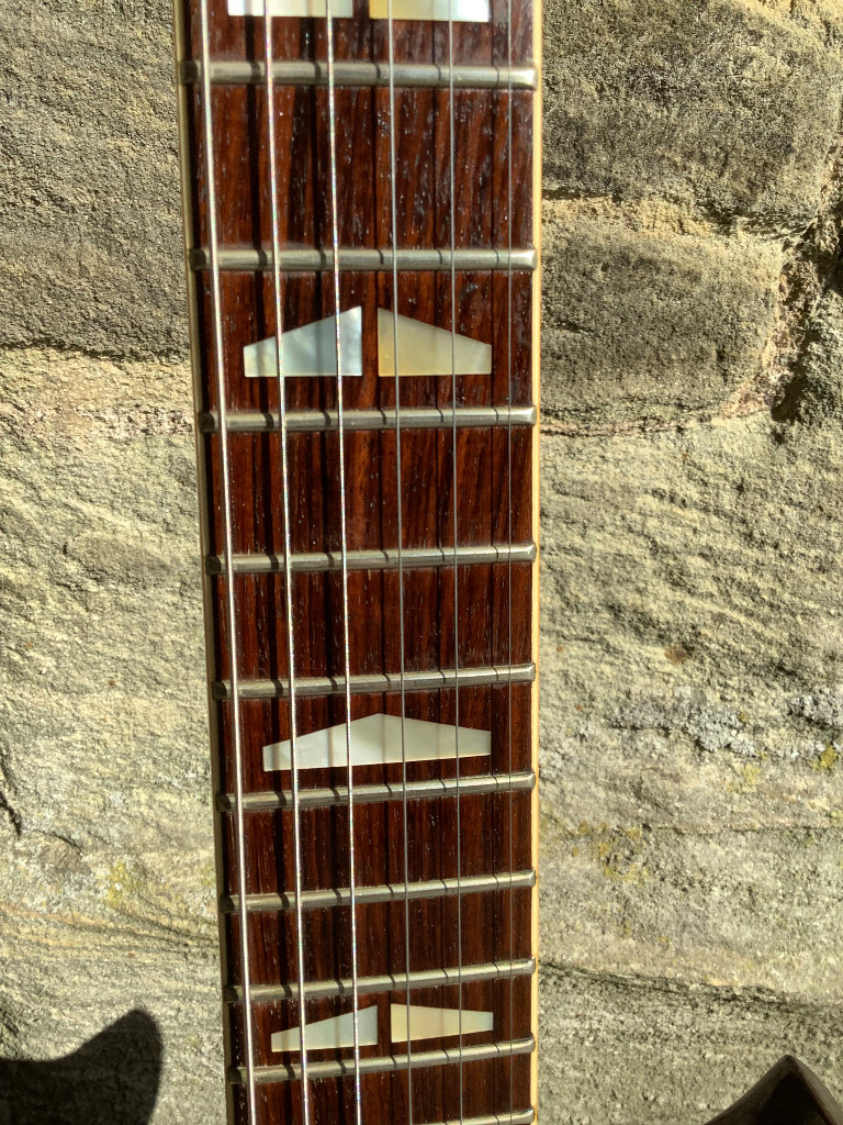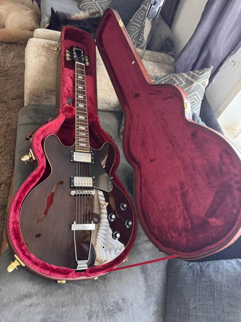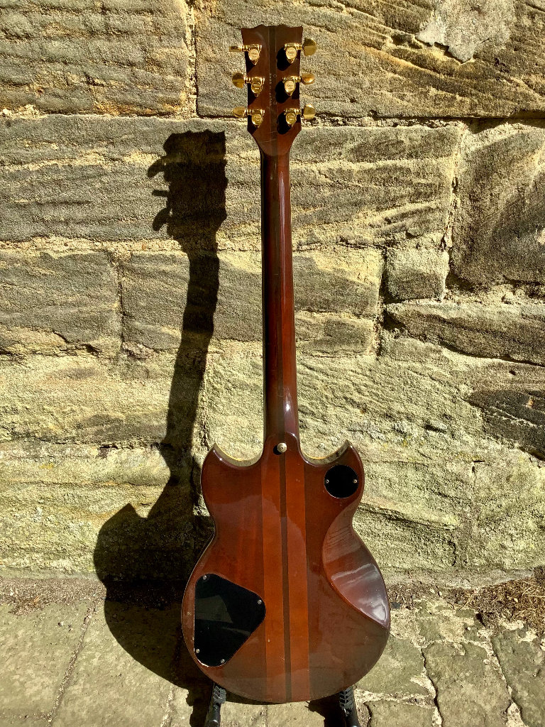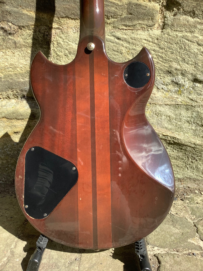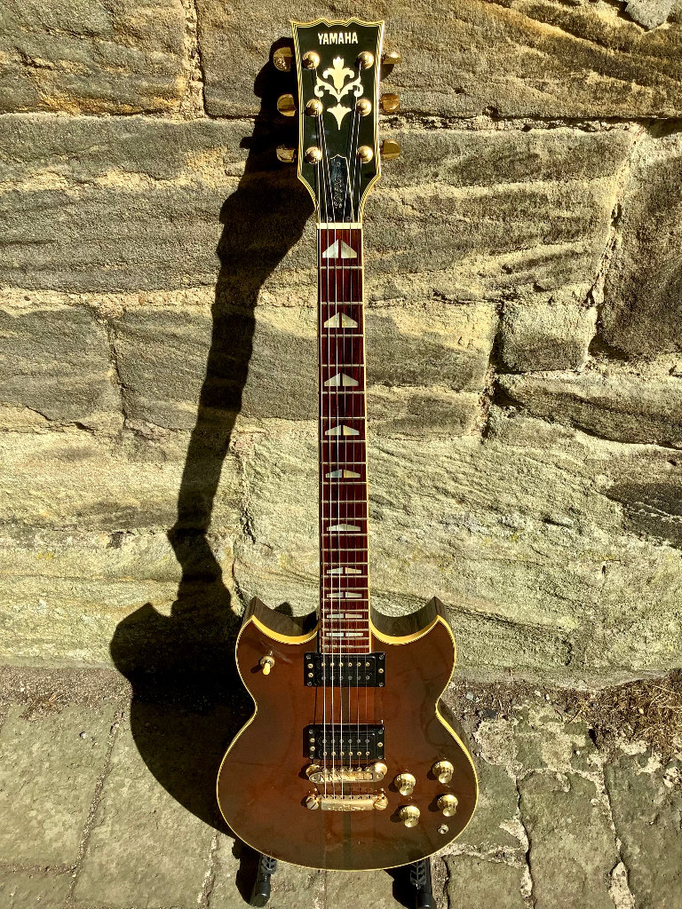 Yamaha SG-1500, in a walnut finish, made in Japan in 1982. Heavy guitar with mahogany body, maple cap, thru-body laminated woods neck. The guitar is very clean and only shows signs of very minor use, no breaks or structural damage. The brass hardware exhibits slight tarnishing. More detailed pictures are available. The tuning pegs and electrics are fully functional, and the electrics, pickups etc are in good condition. Includes case.