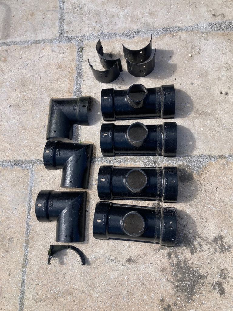 3inch/7.8cm downpipes and 4 3/4 inch/12cm gutters and various fittings.