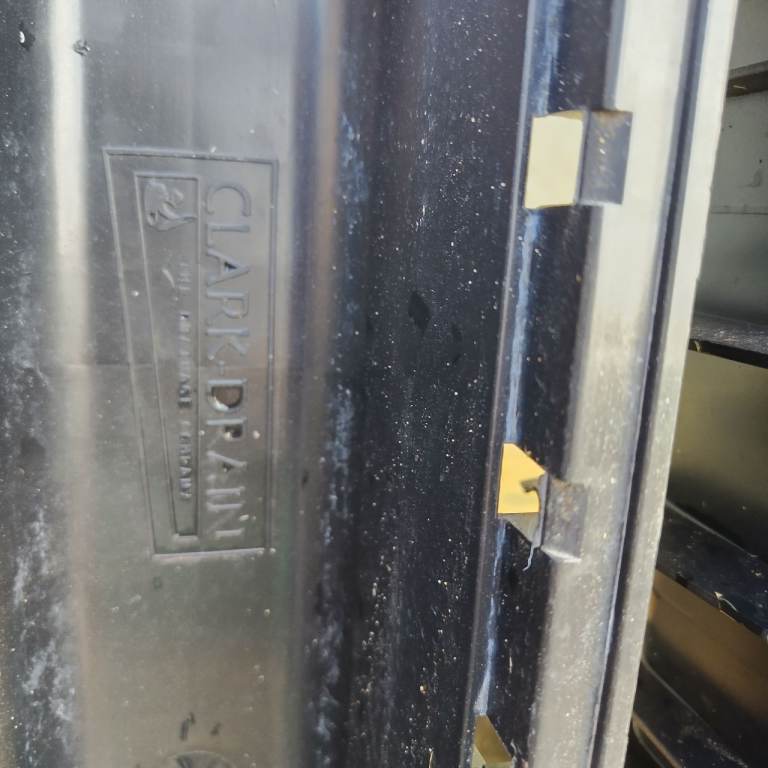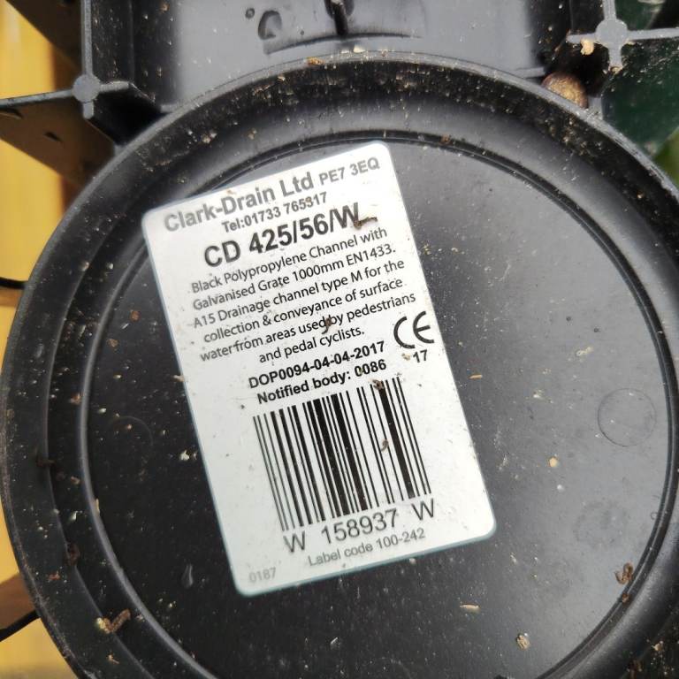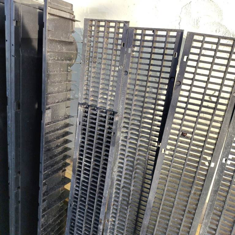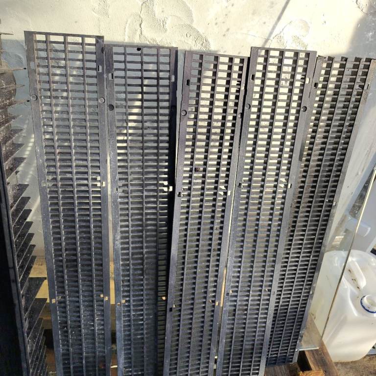 Bought for a project from Wickes but unused. Has been stored outside by building work so has some paint/cement splashed. 5 drain bases and 4 complete grills. The builders cut 1 grill so it's only 80cm. Also I noticed a small chipped area on 1. Please see photos.