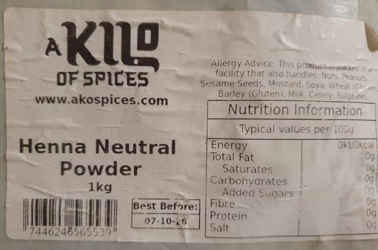 A Kilo of Spices Neutral (no colour) Henna 1 kg. Premium Quality for hair care. Best before: 7/10/26. New unopened bag. This henna is neutral, it has no colour but helps with hair and sculp.