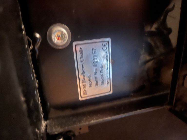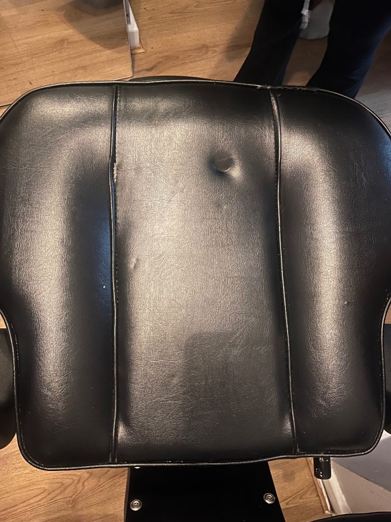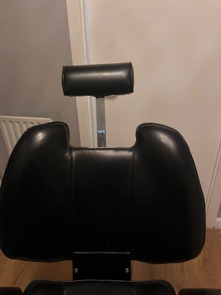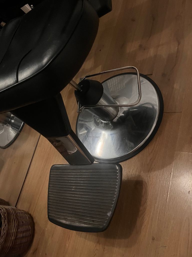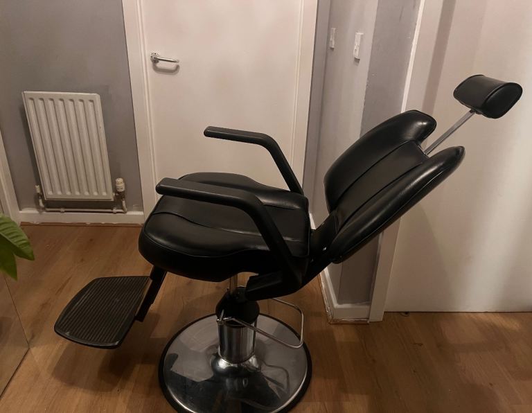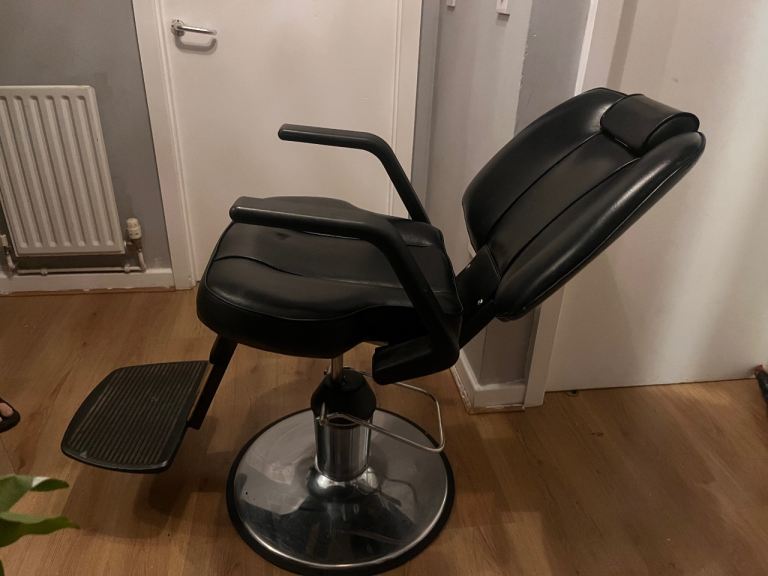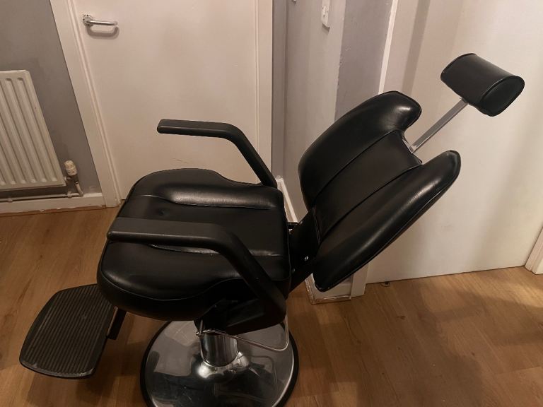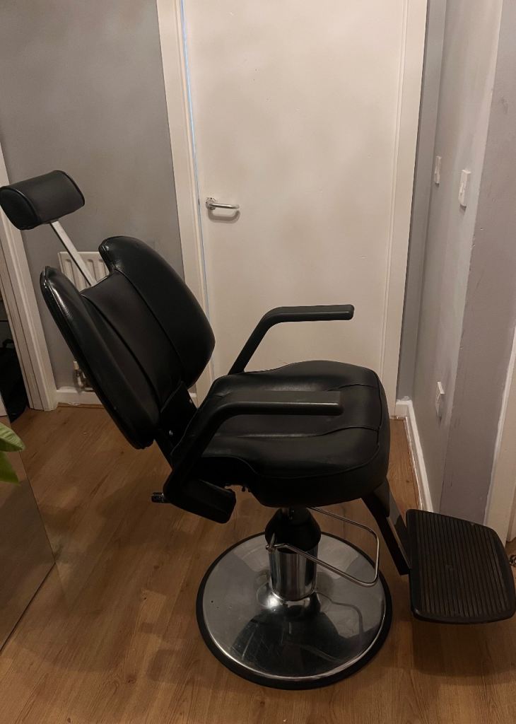 High-quality professional barber/salon chair in black faux leather. Solid and comfortable, ideal for barbers, hair stylists, or home studio setups.